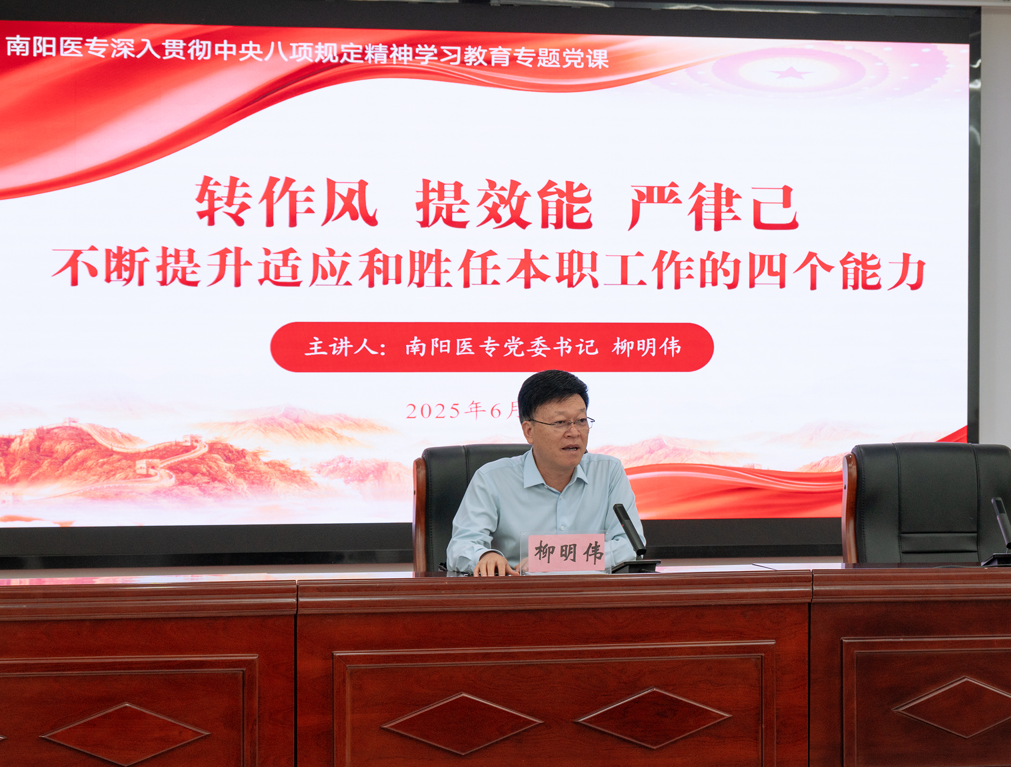 本网讯(文/组织部 张羽东 邢富斌)在全党开展深入贯彻中央八项规定精神学习教育的重要时期,6月30日下午,校党委书记柳明伟以《转作风 提效能 严律己 不断提升适应和胜任本职工作的四个能力》为题,为全校党员干部讲授专题党课。