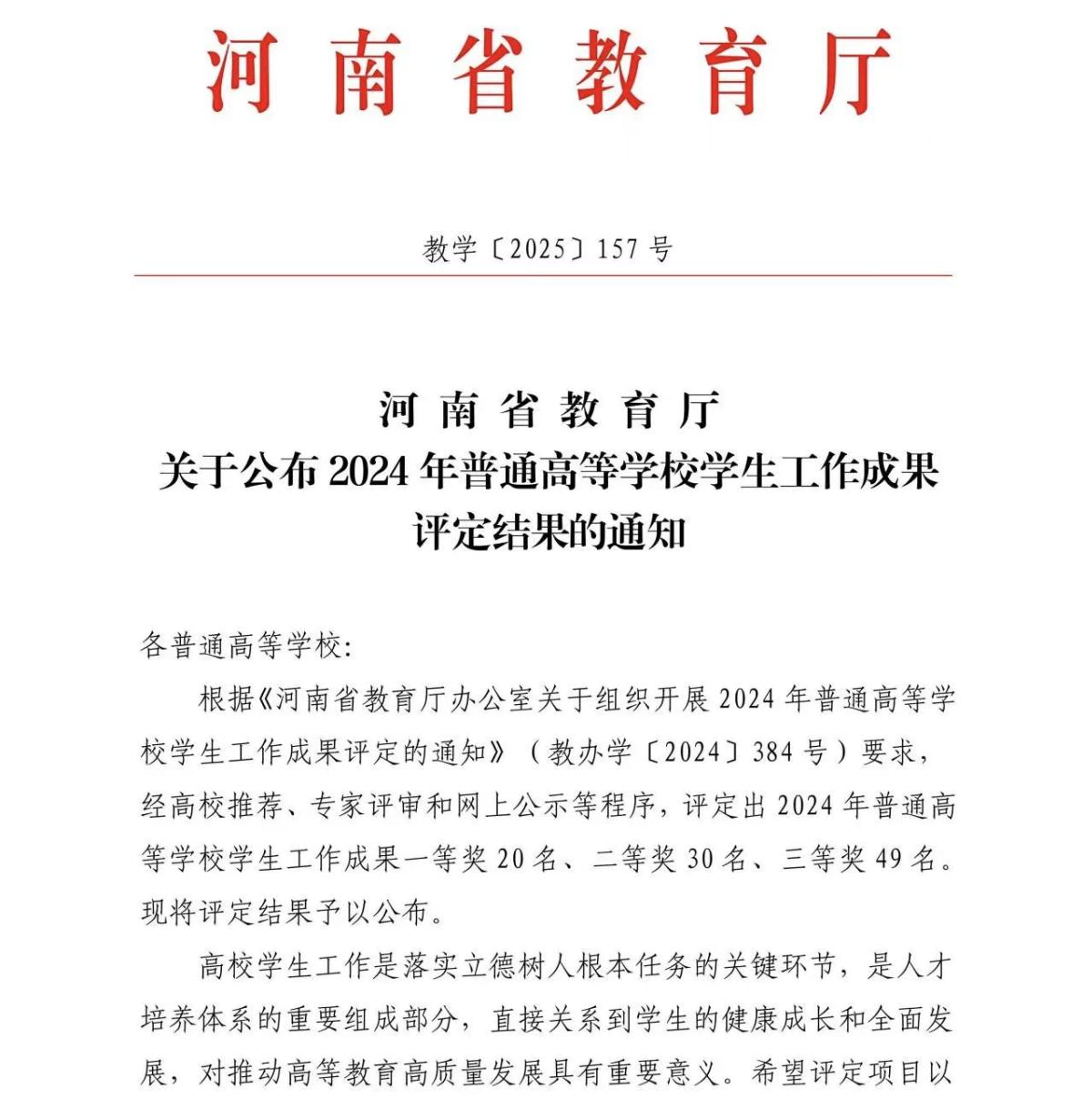 本网讯(文/心理健康关爱与教育中心 李孟辉)近日,我校申报的《“点亮心灯”公益引领,“五心联动”育心赋能》在河南省2024年度普通高等学校学生工作成果项目评选中荣获一等奖。