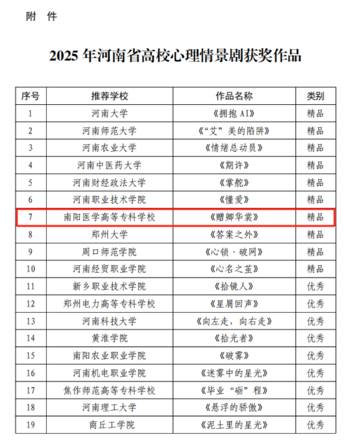 本网讯(文/心理健康关爱与教育中心 李孟辉)近日,河南省教育厅公布了全省高校心理情景剧作品遴选结果,全省共评选出10部精品作品,我校报送的《赠卿华裳》从众多作品中脱颖而出,被评选为“精品”档次,并受邀于10月20日晚参加省教育厅组织的现场展演。