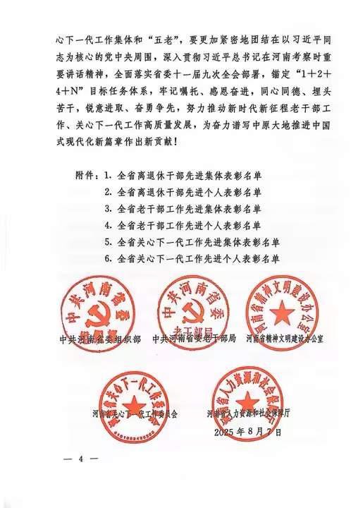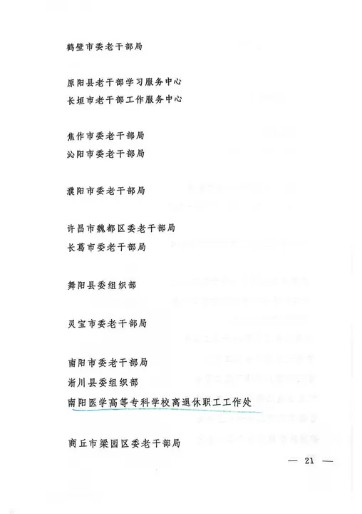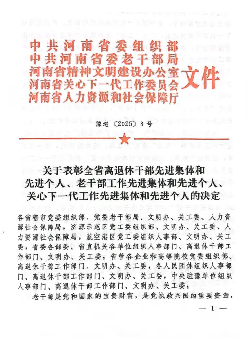 本网讯(文/离退休职工工作处 倪立)河南省委组织部、省委老干部局、省文明办、省关工委、省人社厅联合印发《关于表彰全省离退休干部先进集体和先进个人、老干部工作先进集体和先进个人、关心下一代工作先进集体和先进个人的决定》,我校离退休职工工作处荣获“全省老干部工作先进集体”称号,关工委常务副主任、原党委副书记张金虎同志荣获“全省关心下一代工作先进个人”称号。