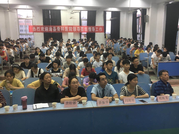 本网讯(文/针灸骨伤系 李明哲)6月12日晚,针灸骨伤系在1号教学楼南301教室举办实习就业专题宣讲会。安阳市滑县骨科医院骨伤科明海龙、唐盼娜、薛振华及疼痛科闫培培医师出席本次宣讲会。教务处副处长王春成、针灸骨伤系全体党政领导班子成员、辅导员和实习班班主任以及优秀学生代表、2017级安阳籍学生150余人参加会议。