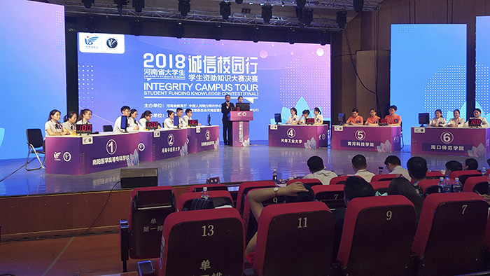 河南省大学生“诚信校园行”学生资助知识大赛决赛由河南省教育厅、中国人民银行郑州中心支行、中国银行业监督管理委员会河南监管局、国家开发银行河南省分行联合主办,许昌学院承办。本次大赛以“宣传政策、普及知识、铸就诚信”为主题,旨在宣传学生资助政策、普及金融基础知识,培养大学生诚信意识和金融风险防范意识。此次大赛分为初赛、复赛和决赛三个阶段,自2017年10月起,历时8个月。初赛由全省134所高校自行组织,复赛分为七个赛区进行,我校在复赛区A组比赛中,以一等奖的好成绩晋级决赛。