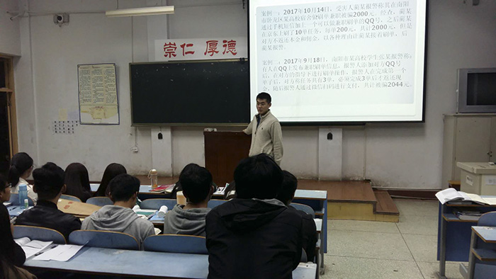 李俊杰老师介绍了针对高校师生的诈骗有电信诈骗、网络诈骗和街头诈骗三大类,其中又以电信诈骗、网络诈骗等远程非接触式诈骗尤为突出。李老师为大家讲述了近期发生的一些案例,并为同学们逐一分析,让同学们了解犯罪团伙的诈骗过程,使同学们认识到事件的严重性。同时,李老师给同学们总结了一些防范要点:1、通过正规可靠平台寻找网上兼职,对需要预付保证金、先行垫付资金的兼职工作要谨慎鉴别;2、天下没有免费的午餐,对于可以轻易“获取高额回报”的工作要保持高度警惕,不要随意相信;3、如果不慎被骗,应注意及时收集证据,如聊天记录、交易记录、联系方式等,并迅速拨打110报警。