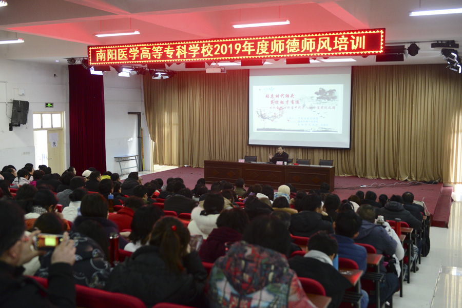 本网讯(文/教务处 梁亮)人勤春来早,万事日相催。2019年2月27日下午,南阳医专在新东区报告厅开展了2019年度师德师风教育培训活动。学校全体专兼职教师参加了培训,本次活动由校党委委员,副校长范真主持。