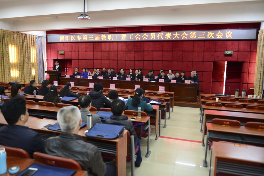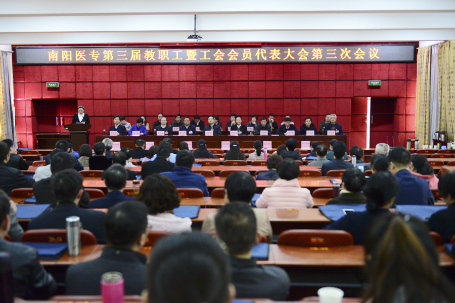 本网讯(文/校工会 朱东民)我校第三届教职工暨工会会员代表大会第三次会议于3月24日在图书馆五楼报告厅隆重举行。校党委书记全新明、校长方家选以及逵应坤、张国良、张胜海、郭万周、田端、范真等校领导在主席团前排就坐,出席大会代表123人。会议听取、审议、通过了《学校工作报告》《工会工作报告》《南阳医专2018年度财务预算执行情况及2019年度财务预算报告》。