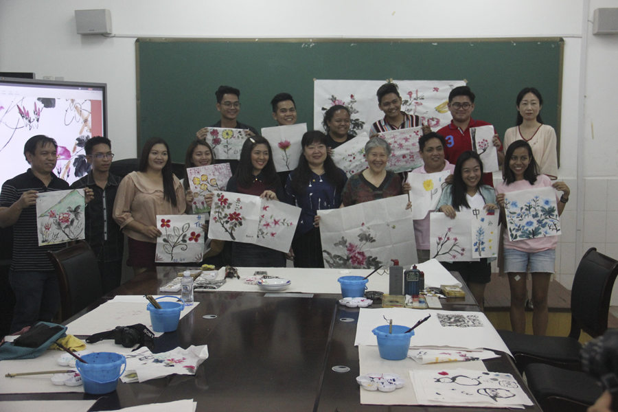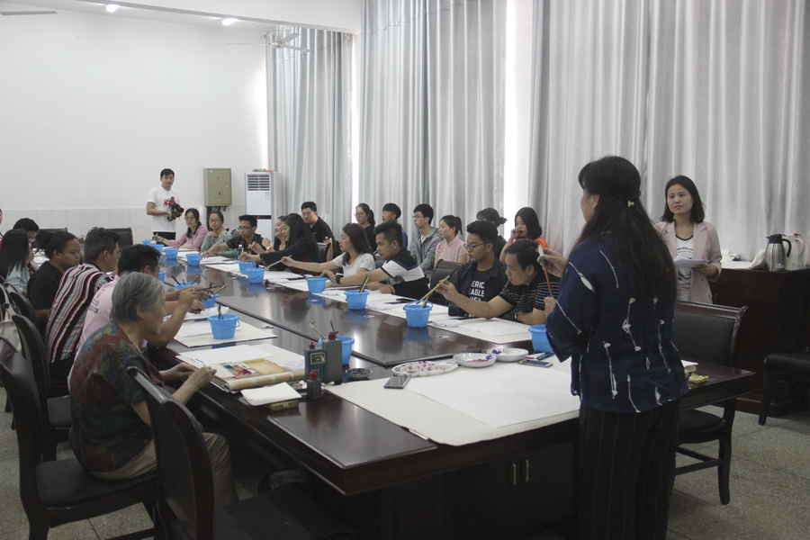 5月20日下午,我校合作院校交流师生在4号教学楼408教室学习体验国画艺术。临床医学系仵湘君老师讲授并现场示范,刘佰蕾老师担任翻译。仵老师结合国画作品简要介绍了国画的类型,讲解了羊毫笔用笔技巧。随后,现场创作国画牡丹并教授如何进行绘画。绘画过程中,仵老师依次进行指导。(编审/李峰松 摄影/国际教育学院)