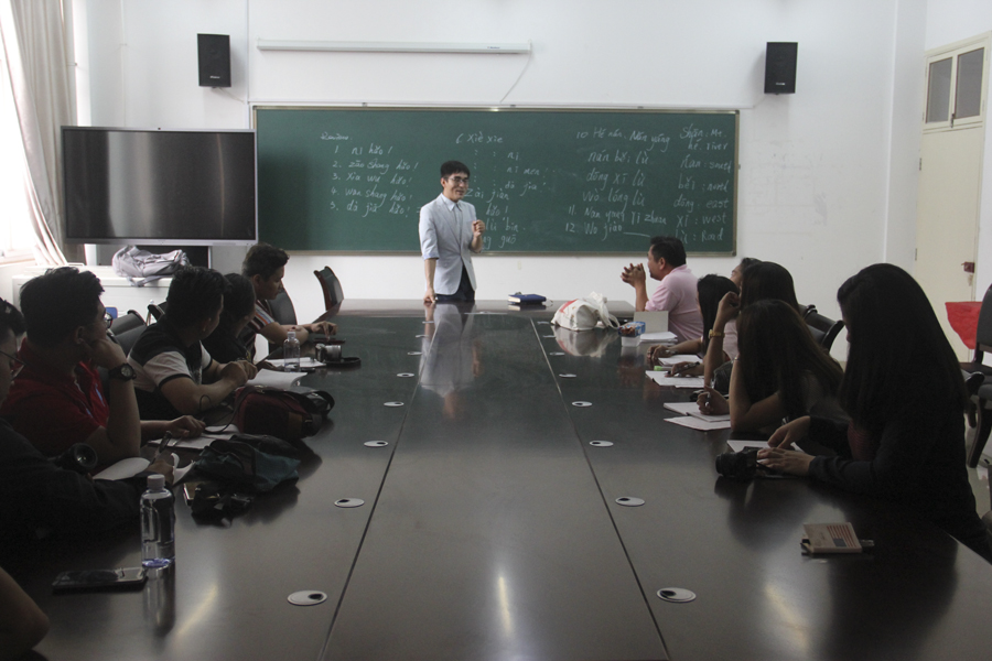 本网讯(文/国际教育学院记者站 高山云 张岚昕)5月20日上午,我校合作院校交流师生在3号教学楼423会议室第二次学习对外汉语课程,由周国军老师讲授。周老师带领交流师生温习了上次课程内容。随后,指导大家学习新的汉语知识,学习用中文演唱《两只老虎》。周老师最初和交流师生共同唱歌,之后让其单独合唱。交流师生不负众望,最终能够流利演唱歌曲。在课程结束前,他们共同合唱歌曲送给周老师,感谢他的悉心教导。