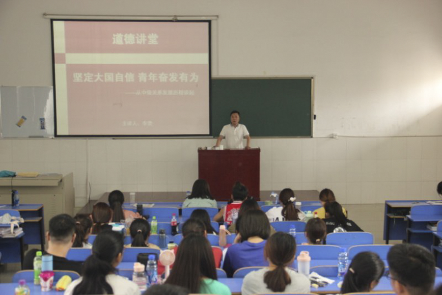 本网讯(文/国教院记者站 魏雅伦)6月26日下午,我校在仲景西区3号教学楼505教室举办以“坚定大国自信,青年奋发有为”为主题的道德讲堂。本次活动由国际教育学院承办,辅导员李斐老师主讲,百余名师生参加活动。