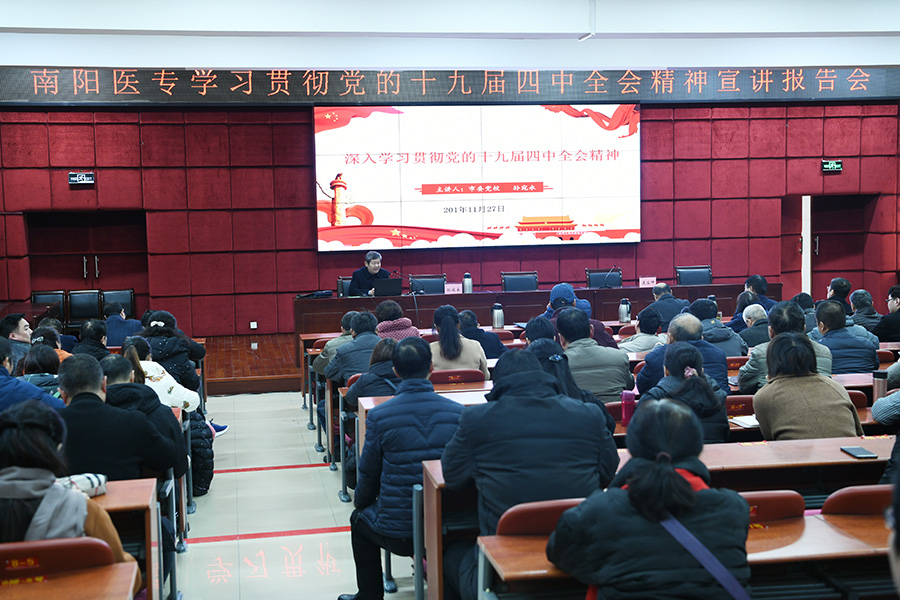 本网讯(文/宣传部 潘晓红)11月27日下午,我校在仲景西区图书馆五楼报告厅举行学习贯彻党的十九届四中全会精神宣讲报告会。特邀市委十九届四中全会精神宣讲团成员、市委党校常务副校长孙宛永作宣讲报告。校本部副科级以上干部,一附院书记、院长,二、三附院副科级以上干部参加了报告会,报告会由党委副书记逵应坤主持。