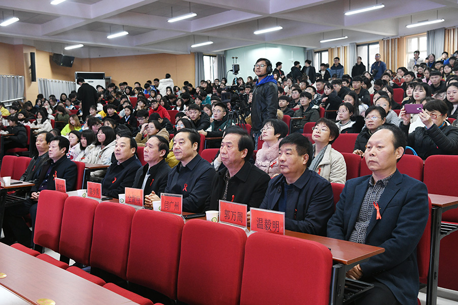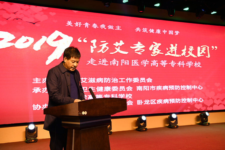 本网讯(文/学生处 余飞海)在第32届世界艾滋病日即将到来之际,11月26日下午,南阳市“防艾专家进校园”活动在我校仲景东区报告厅隆重举行。市卫健委党组书记、主任闫广州,副主任陈少禹,市疾控中心党委书记温毅明和我校领导全新明、郭万周等出席。南阳市、卧龙区有关部门人员和我校400余名师生参加了本次活动。