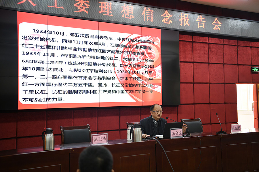 报告会上,张金虎教授以《发扬长征精神 争做时代新人》为题,通过生动详实的案例和深入浅出的语言,讲解了长征形成的历史原因,长征的过程和伟大意义,什么是伟大的长征精神,以及新时代的青年应该怎么样发扬伟大的长征精神。在新长征路上,我们应继承和发扬当年红军长征的精神,把长征这份宝贵的精神财富变成推动我们争做时代新人的巨大精神力量,做担当中华民族复兴大任的时代新人。