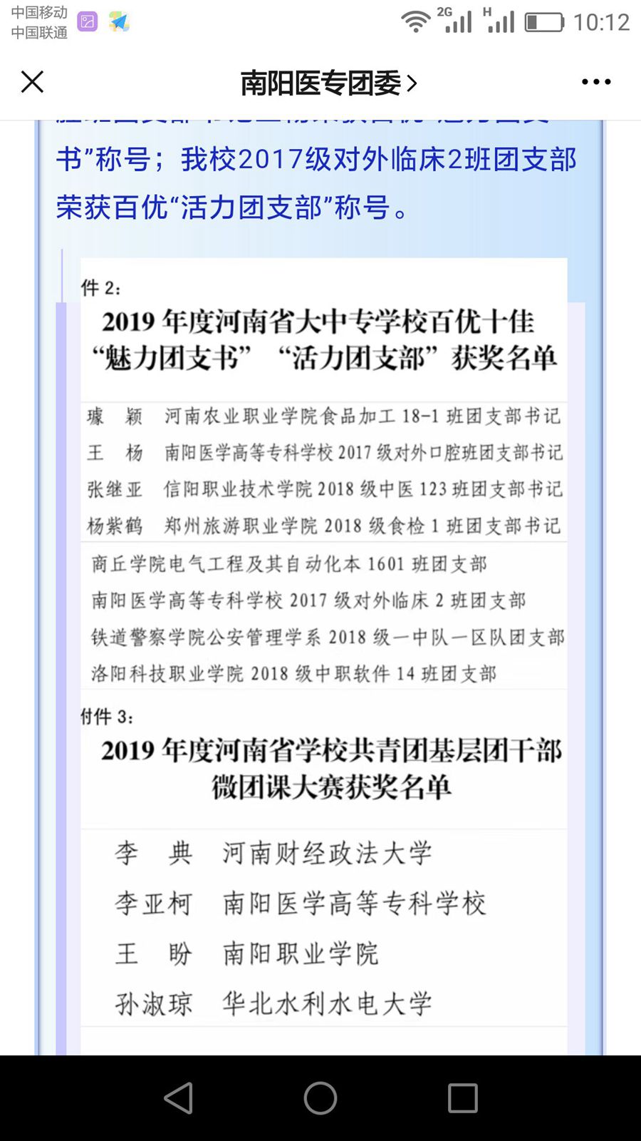 经过激烈角逐,我校《搭建合作育人桥梁 推进文明交流互鉴 》荣获河南省学校共青团工作项目大赛高校组一等奖;我校李亚柯荣获河南省学校共青团基层团干部微团课大赛高校组三等奖;我校2017级对外口腔班团支部书记王杨荣获百优“魅力团支书”称号;我校2017级对外临床2班团支部荣获百优“活力团支部”称号。
