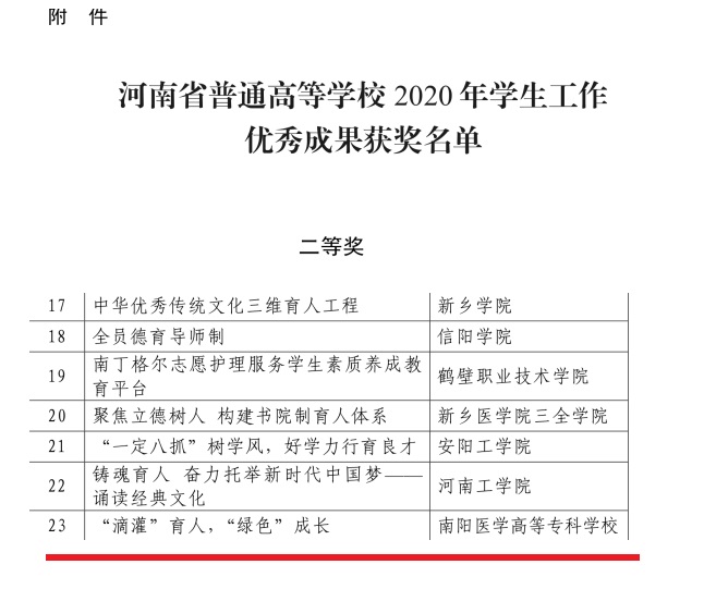 本网讯(文/护理系 闫珂)近日,河南省教育厅下发《关于表彰2020年普通高等学校学生工作优秀成果的决定》,我校由护理系申报的《“滴灌”育人, 绿色成长》项目获评2020年河南省普通高等学校学生工作优秀成果二等奖。