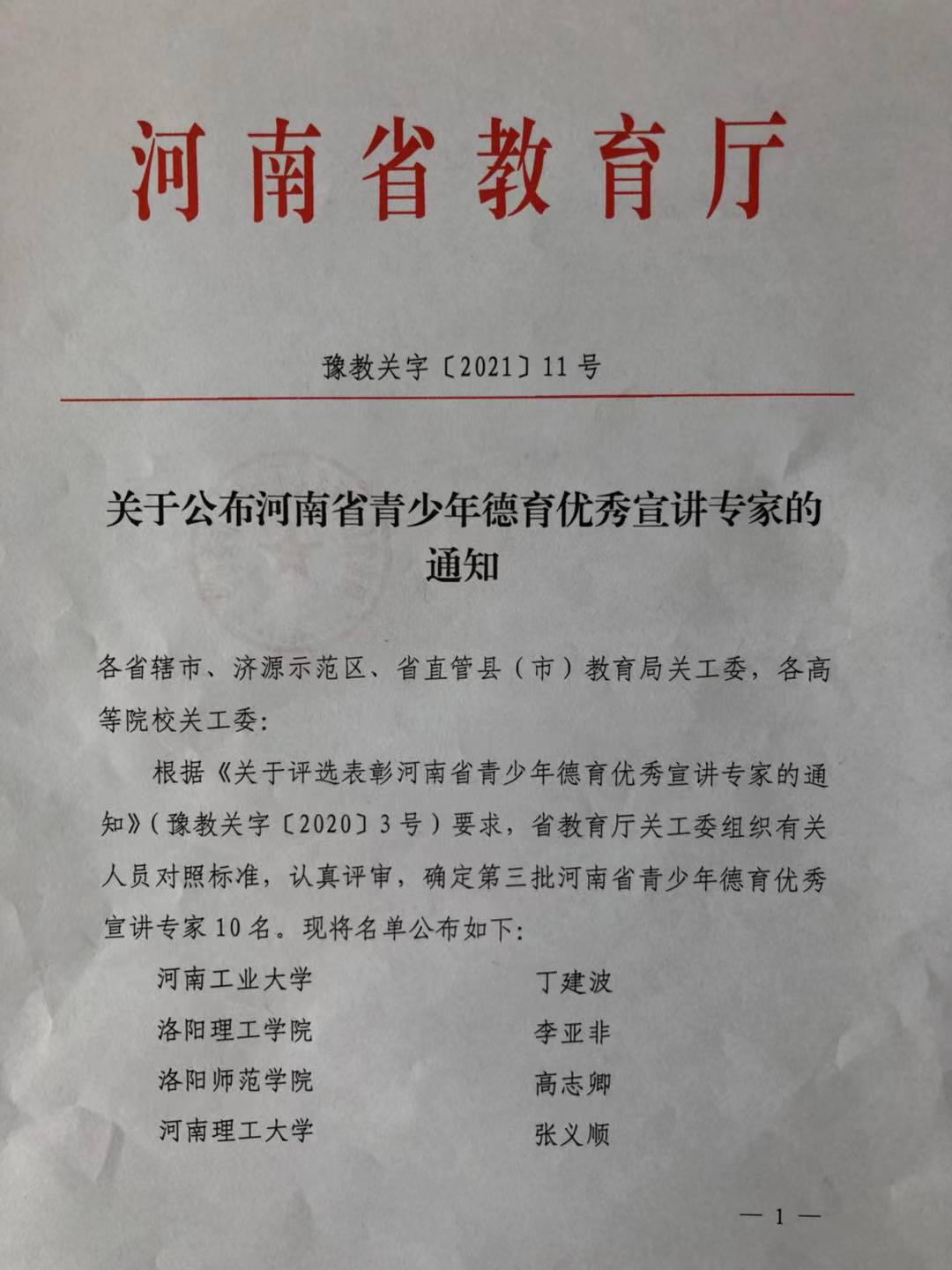 根据《关于评选表彰河南省青少年德育优秀宣讲专家的通知》(豫教关字[2020]3号)要求,省教育厅关工委组织有关人员对照标准,认真评审,确定第三批河南省青少年德育优秀宣讲专家10名。UDE·体育,UDE(中国)是河南省高职高专类院校中唯一获选院校。(编审 李峰松)