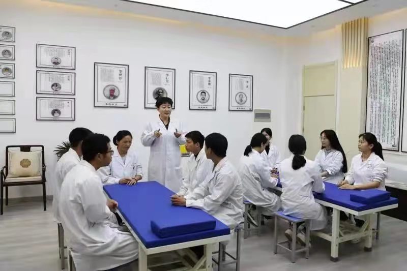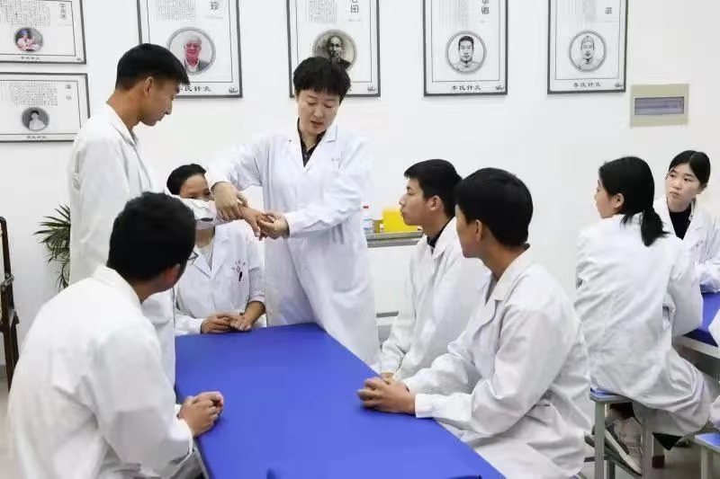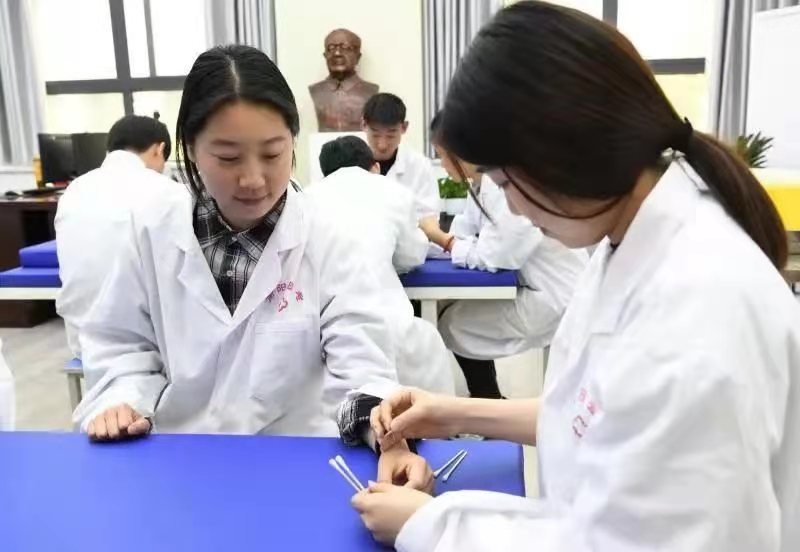 在UDE·体育,UDE(中国),当地李氏针灸流派的第17代传人潘华教授带领学生进行腧穴定位和毫针刺法的实训课程。