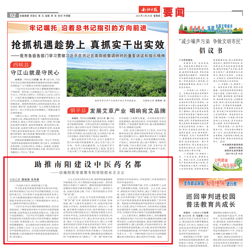 王立义还高兴地告诉记者,南阳将恢复重建张仲景国医大学,对于南阳医专是重大利好。1985年,老一辈无产阶级革命家习仲勋指导创办了张仲景国医大学,并亲自协调筹建。赓续其医脉的南阳医专高擎张仲景医学教育的旗帜,走出了一条特色凸显、内涵式发展之路,守住了张仲景国医大学的“根”和“魂”。