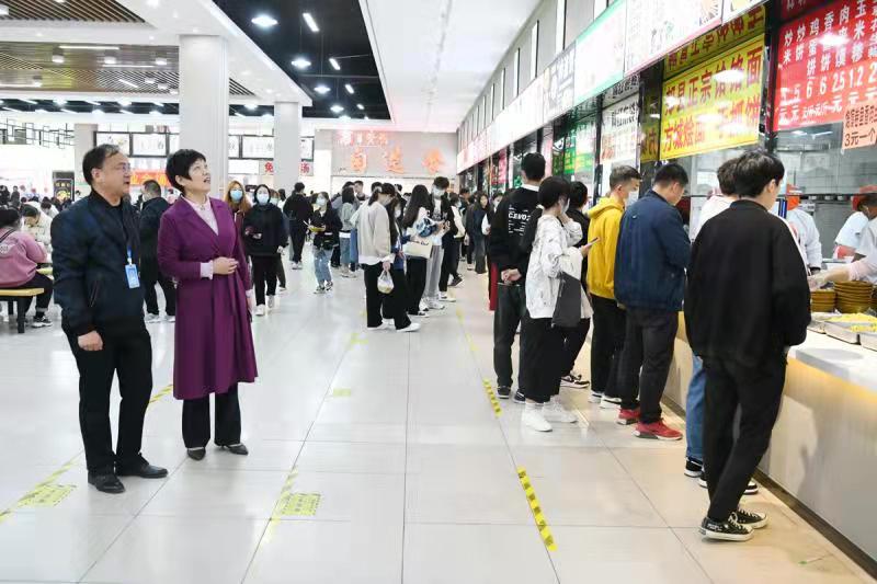 在学生食堂,领导们先后查看了后厨操作间、储藏室、烹饪间、售卖间等重要部位。调研过程中,校领导与学生共同就餐,同大家进行了深入交流,倾听学生意见,对就餐高峰期排队、学生对食堂伙食质量和价格的评价情况进行了详细了解。