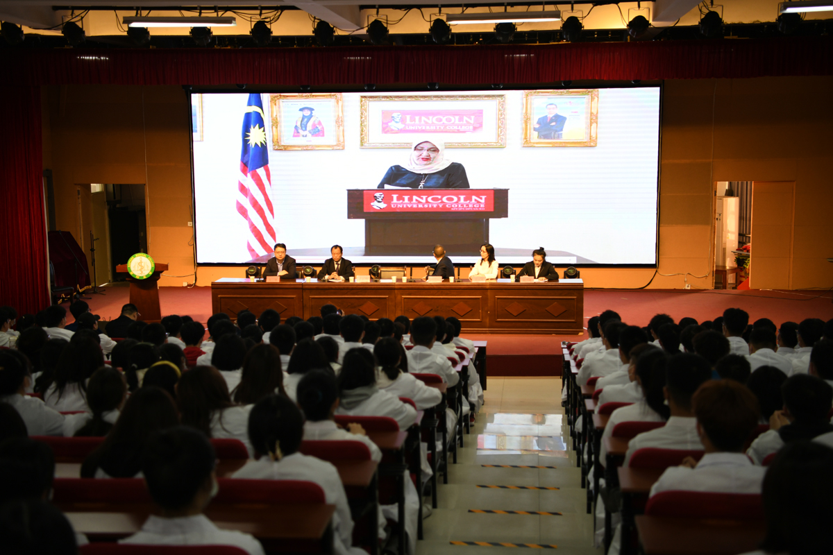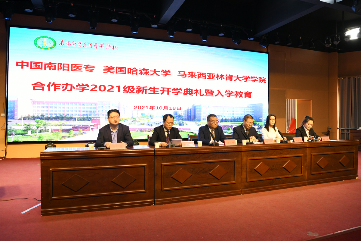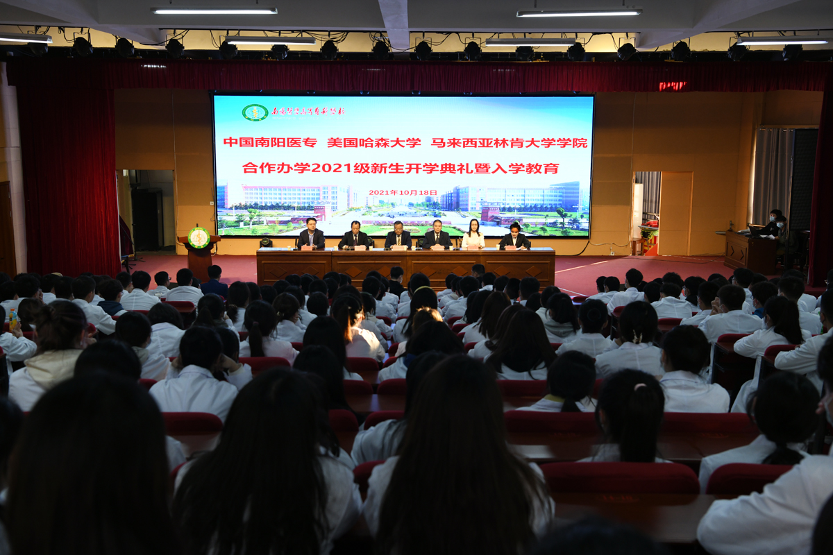 下午5:00,我校在仲景东区报告厅隆重举行中美、中马合作办学项目2021级新生开学典礼暨入学教育。由外事国教党总支书记卢朝彬主持,马来西亚林肯大学学院校长拿督比、美国哈森大学副校长林恩等合作院校方领导、南阳医专校党委副书记逵应坤出席并致辞。国际教育学院领导、辅导员、班主任及2021级对外临床医学、口腔医学、对外康复治疗技术专业的全体新生参加。