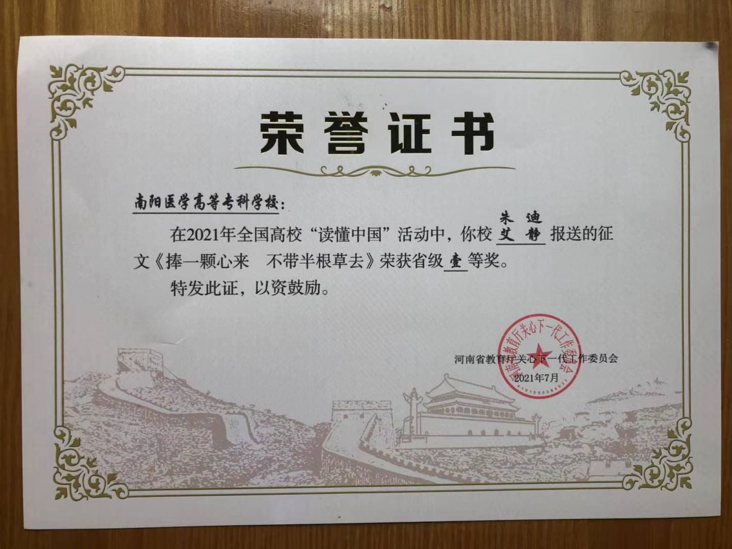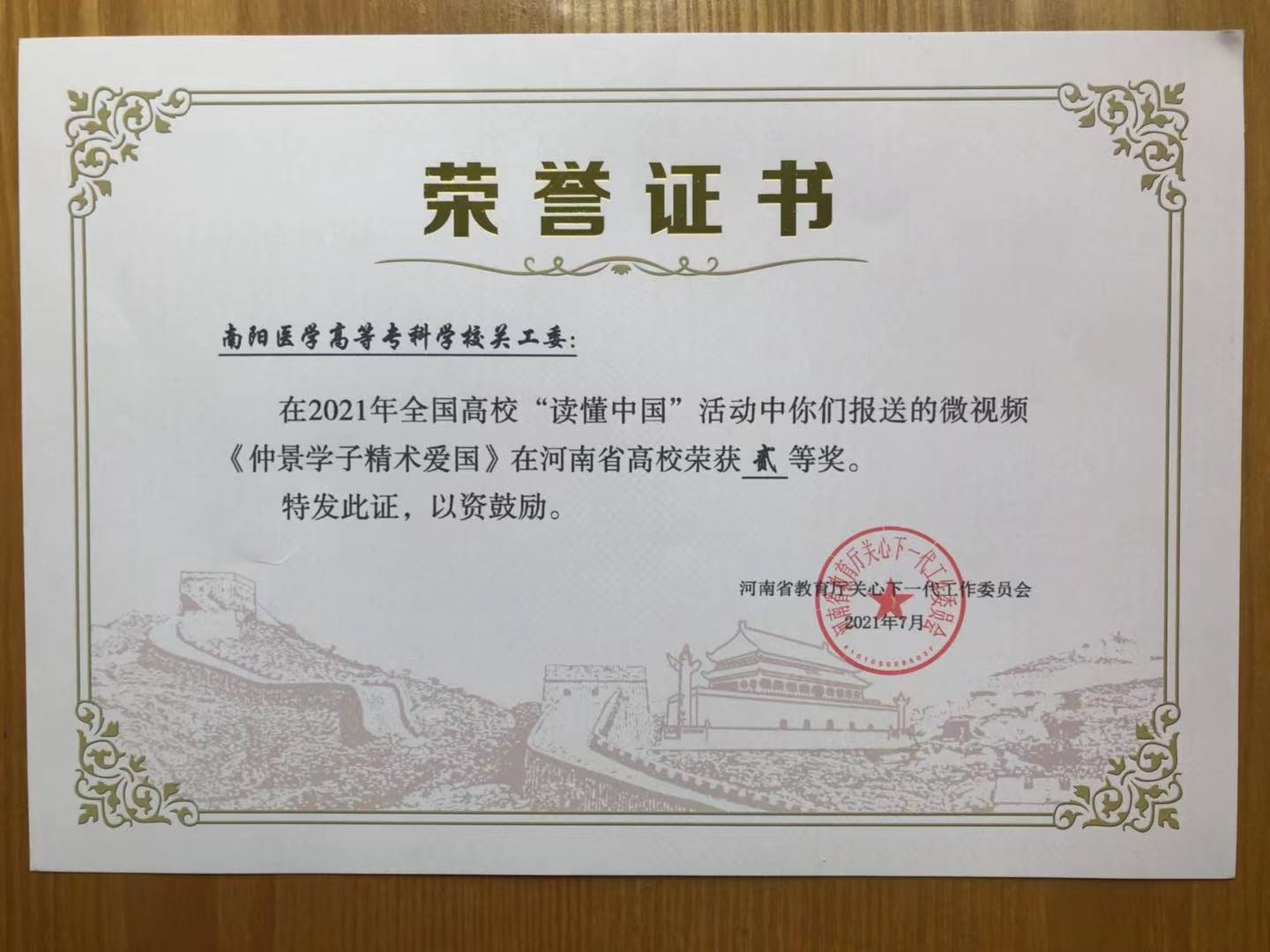 接到活动通知后,我校关工委积极组织相关活动,搜集相关资料。最后由我校关工委报送的征文《捧一颗心来 不带半根草去》获得征文一等奖,微视频《仲景学子精术爱国》获得微视频二等奖,我校关工委获得本次活动的优秀组织奖。(编审 李峰松)
