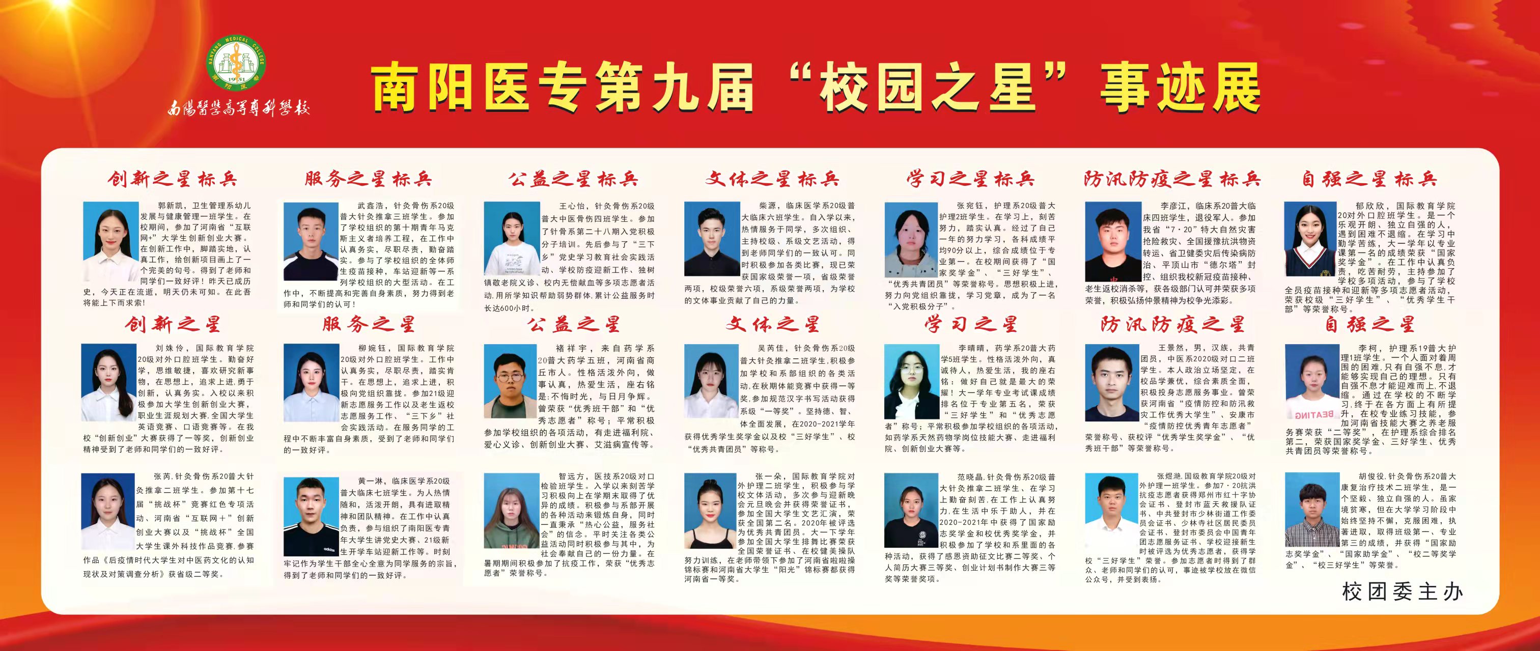 本网讯(文/校团委  古婵婵)为充分展示我校青年学生的精神风貌,挖掘先进典型,发挥榜样模范的示范带动作用,激励广大学生向榜样学习,营造良好学风、校风,构建和谐校园,2021年11月校团委在全校范围内开展了南阳医专第九届“校园之星”评选活动。