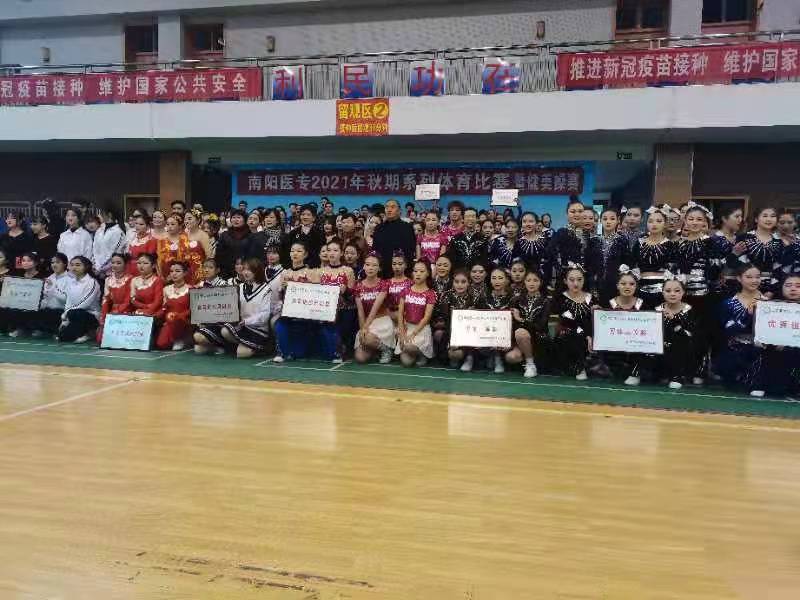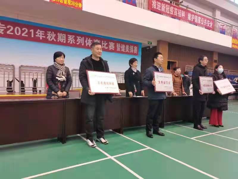 本网讯(体教部  李坤贤)12月15日下午,我校2021年健美操比赛暨秋期系列体育比赛颁奖仪式在仲景西区体育训练馆隆重举行。副校长范真出席并致辞,学生处处长梁顺平、体育教学部书记、主任刘静霞参加颁奖仪式。