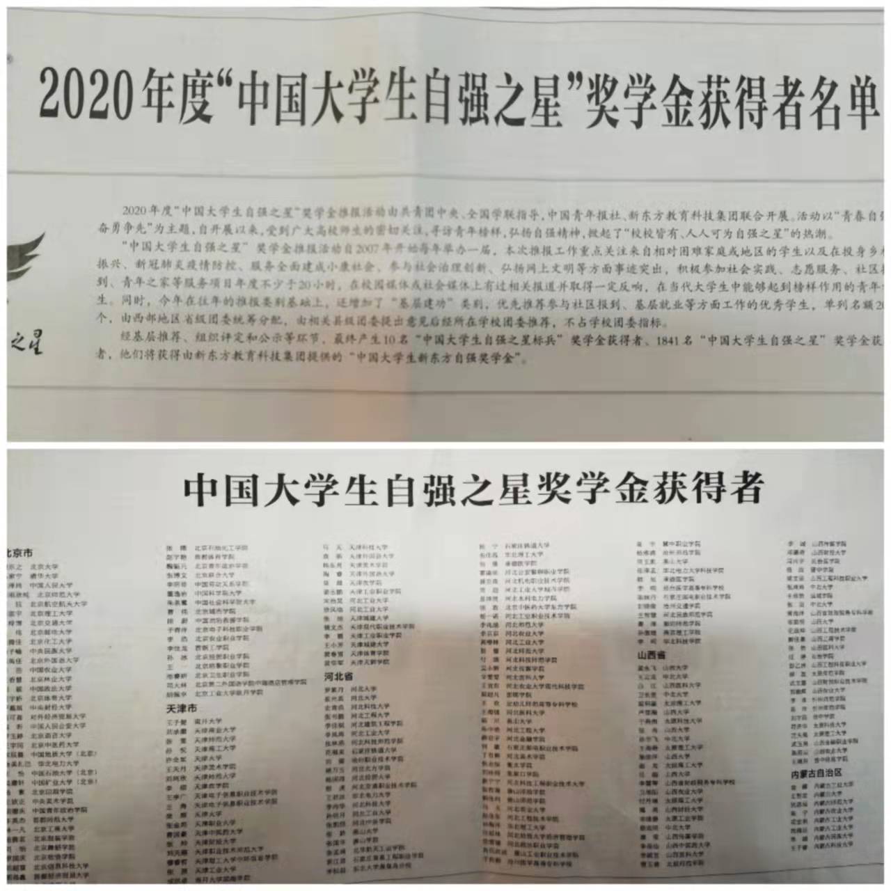 本次中国大学生自强之星奖学金推报工作由共青团中央、全国学联指导,中国青年报社、新东方教育科技集团联合开展。活动以青春自强 奋勇争先为主题,重点关注来自相对困难家庭或地区的学生以及在投身乡村振兴、新冠肺炎疫情防控、服务全面建成小康社会、参与社会治理创新、弘扬网上文明等方面事迹突出,在当代大学生中能够起到榜样作用的青年学生。本次推报工作采用全国三级体系,经学校团委、共青团河南省委两级推荐,全国组委会组织专家召开评审会,最终产生10中国大学生自强之星标兵奖学金获得者、1841中国大学生自强之星奖学金获得者。 河南省共有89名学生荣获中国大学生自强之星奖学金,我校程煜淇同学是其中光荣的一员。自20152021年,我校学生已连续6年获此殊荣。(编审/李峰松)