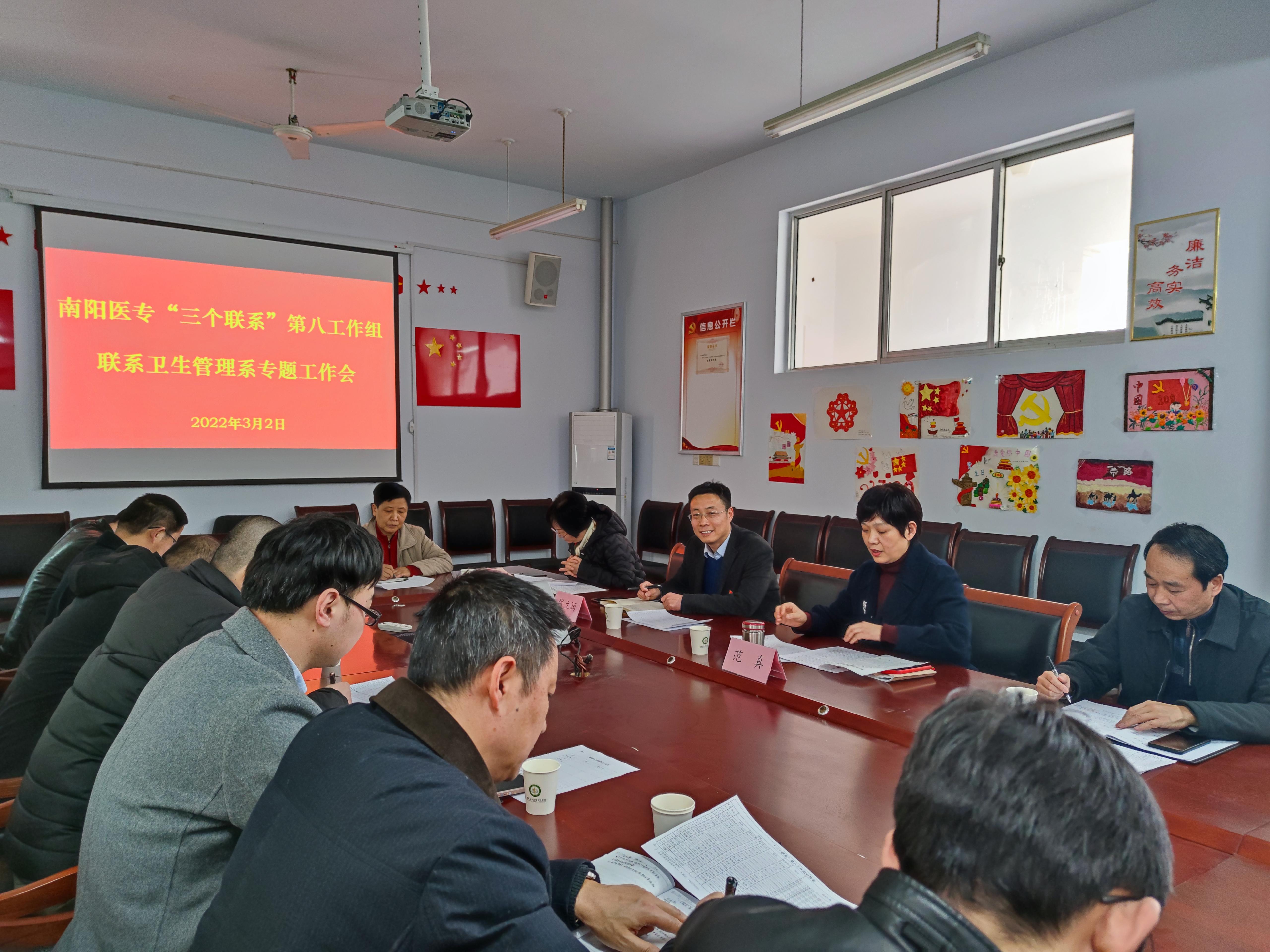 本网讯(文/教务处 梁亮)为贯彻落实《关于推进党史学习教育常态化 建立为师生办实事制度的实施意见》(宛医专党〔2021〕71号)文件精神,把“三个联系”工作制度落地落实,南阳医专“三个联系”第八工作组和卫生管理系于3月2日下午在1号教学楼卫管系办公室召开了专题工作会。第八工作组组长、南阳医专校党委委员、副校长范真,工作组副组长、教务处处长刘荣志带队参加了专题工作会。卫生管理系副科以上干部和全体班主任参会。