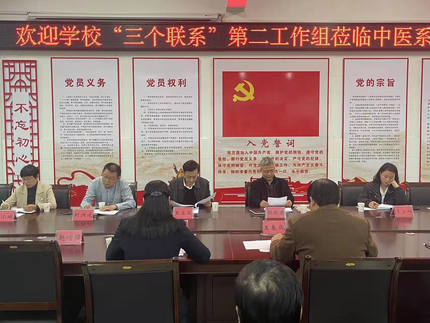 中医系党总支书记张明丽就中医系专业特色、师资力量、学生管理工作作专题汇报。她表示,下一步将强化政治引领,抓好党员干部、辅导员、学生干部三支队伍,重点围绕学风建设、就业创业、资助育人工作,奋力开创新局面。郭延东对为师生办实事“三个联系”工作制度进行了具体解读,第二工作组领导干部与对接班级班主任、学生干部、贫困生代表进行了会面交流。