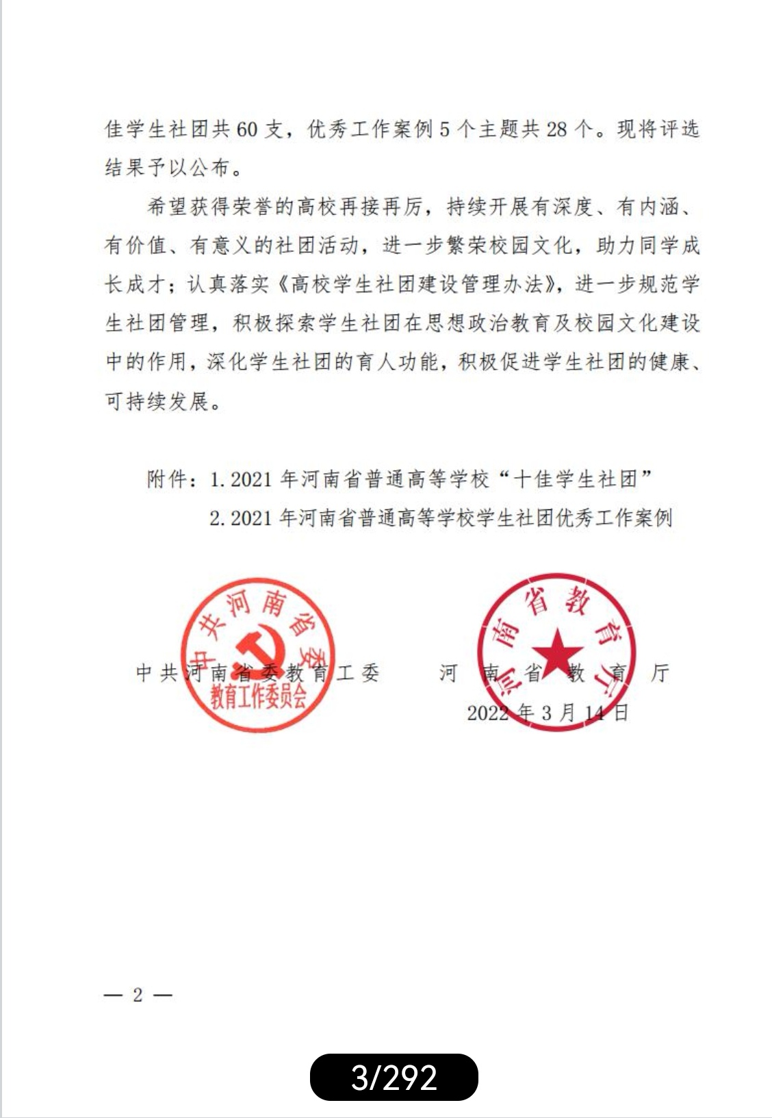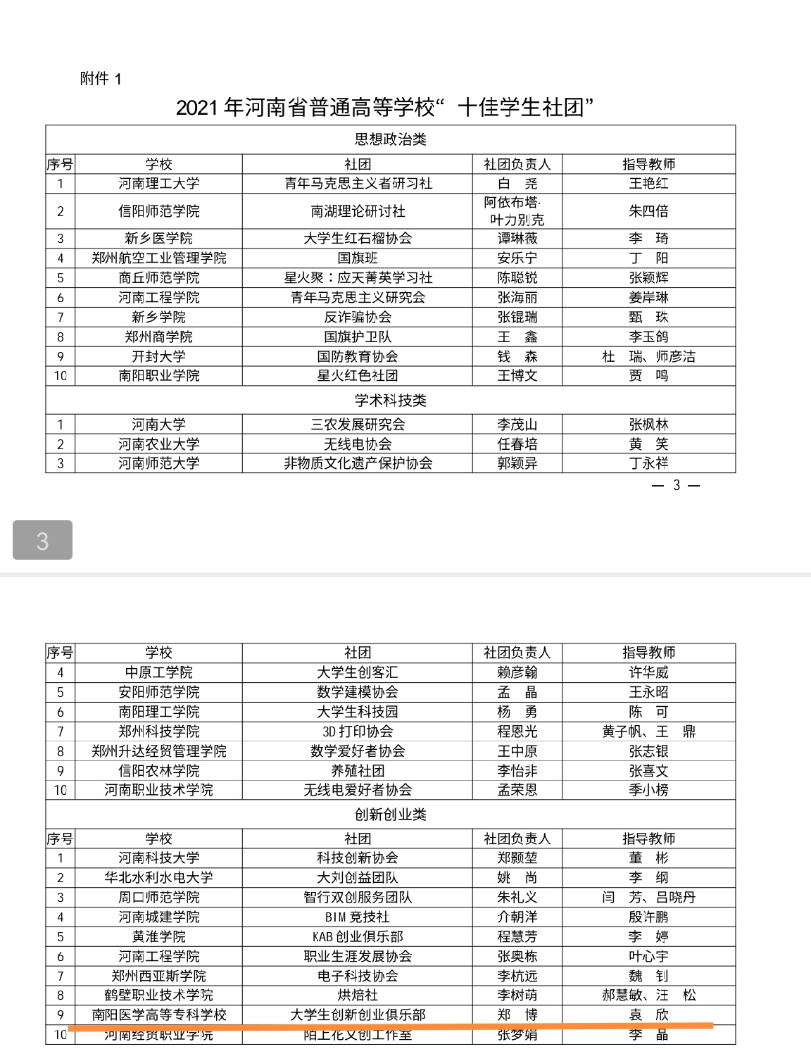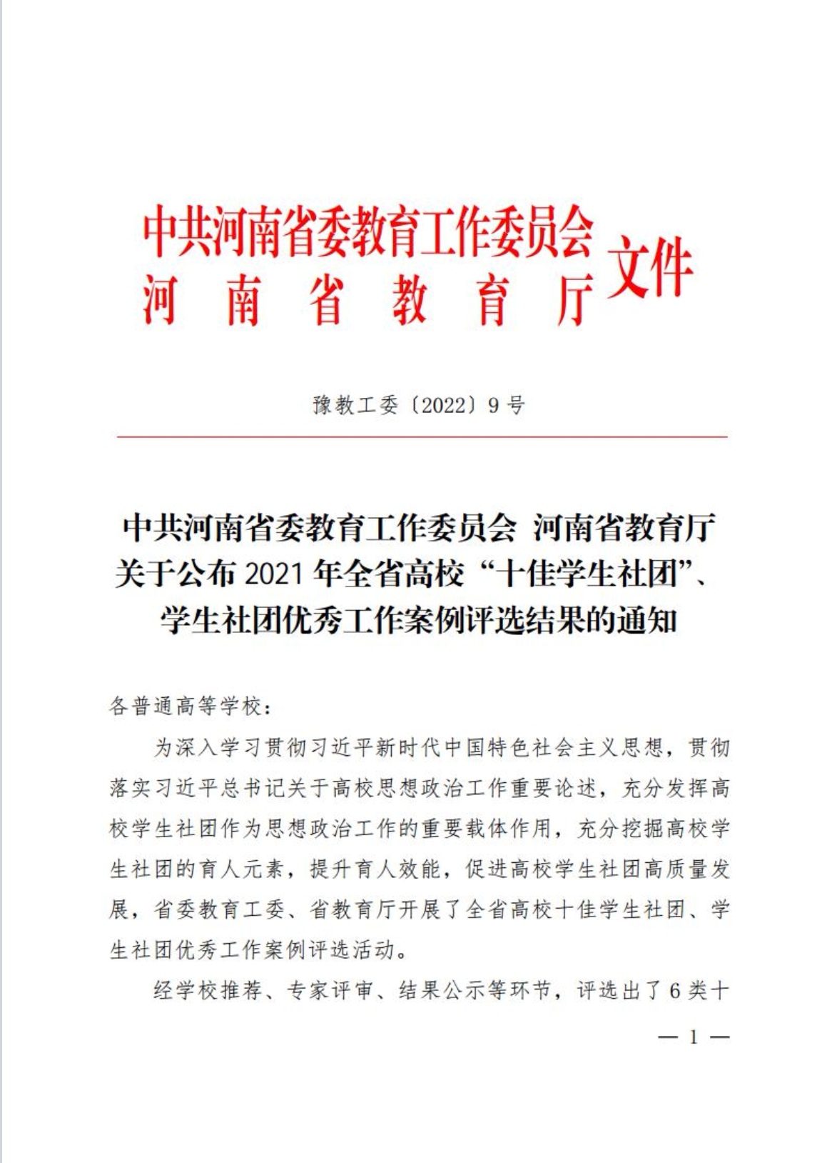 本网讯(文/校团委  庞博)近日,河南省委教育工委、河南省教育厅下发了《中共河南省委教育工作委员会 河南省教育厅关于公布2021年全省高校“十佳学生社团”、学生社团优秀工作案例评选结果的通知》,全省评选出6 类十佳学生社团共 60 支,优秀工作案例 5 个主题共 28 个。