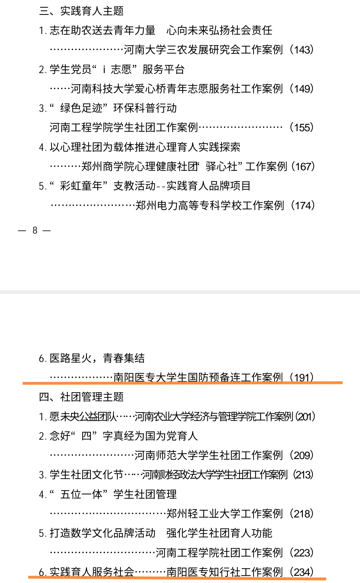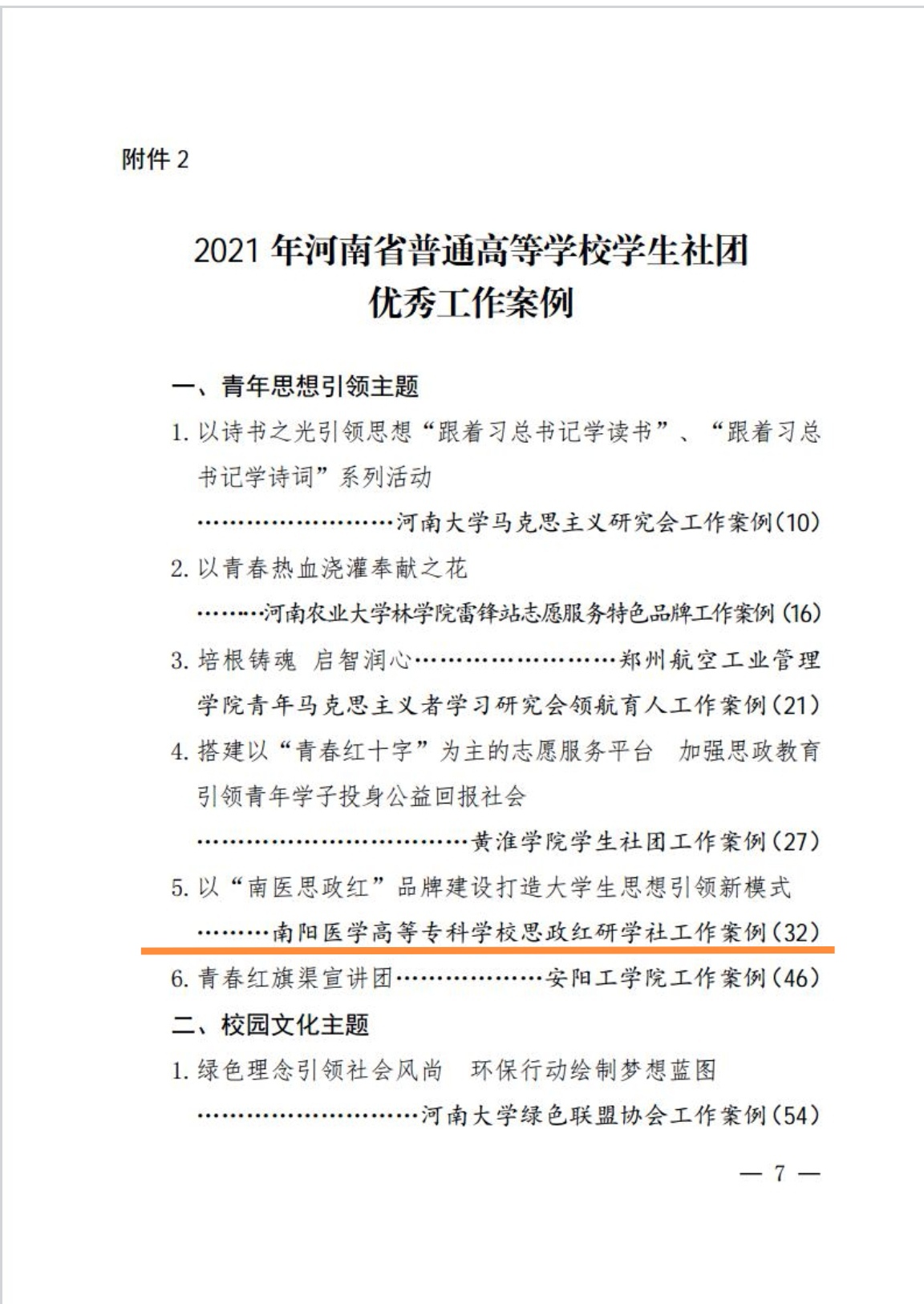 我校学生社团喜获佳绩:南阳医专大学生创新创业俱乐部被评为2021年河南省普通高等学校“十佳学生社团”(业务指导部门:马克思主义学院);南阳医专大学生思政红研学社《以“南医思政红”品牌建设打造大学生思想引领新模式》(业务指导部门:马克思主义学院)、南阳医专大学生国防预备连《医路星火,青春集结》(业务指导部门:临床医学系党总支)、南阳医专大学生临床技能知行社《实践育人服务社会》(业务指导部门:临床医学系党总支)被评为2021年河南省普通高等学校学生社团优秀工作案例。获奖数量在全省名列前茅。
