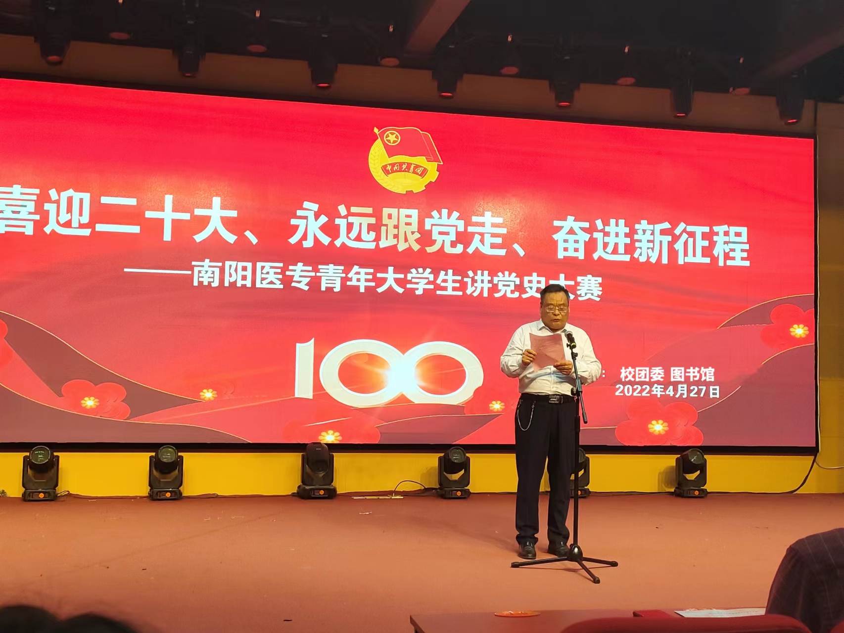 本网讯(文/校团委  古婵婵)4月27日,由校团委、图书馆主办的“喜迎二十大、永远跟党走、奋进新征程”南阳医专青年大学生讲党史大赛在我校仲景东区礼堂隆重举行。校党委副书记逵应坤、校团委书记徐晓杰出席本次比赛,宣传部副部长陈铁良、学生处副处长闫珂、公教部副主任夏曼、图书馆副馆长孟玫、公教部艺术教研室主任张艳担任本次比赛的评委。