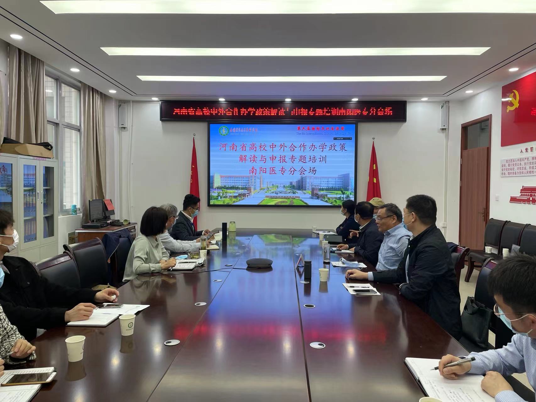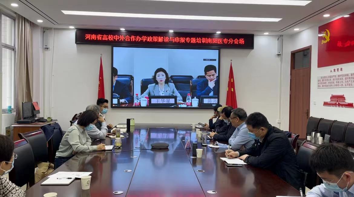 本网讯(文/对外交流合作处  夏灵果)4月28日,河南省高校中外合作办学政策解读与申报专题培训通过“腾讯会议”举办,会议由省教育厅对外合作与交流处处长、河南省教育国际交流协会秘书长王华星主持,南阳医专分会场设在3号教学楼423会议室,党委副书记逵应坤出席,对外交流合作处、国际教育学院、质量管理办公室、教务处、计财处、法制办等部门线上参加。