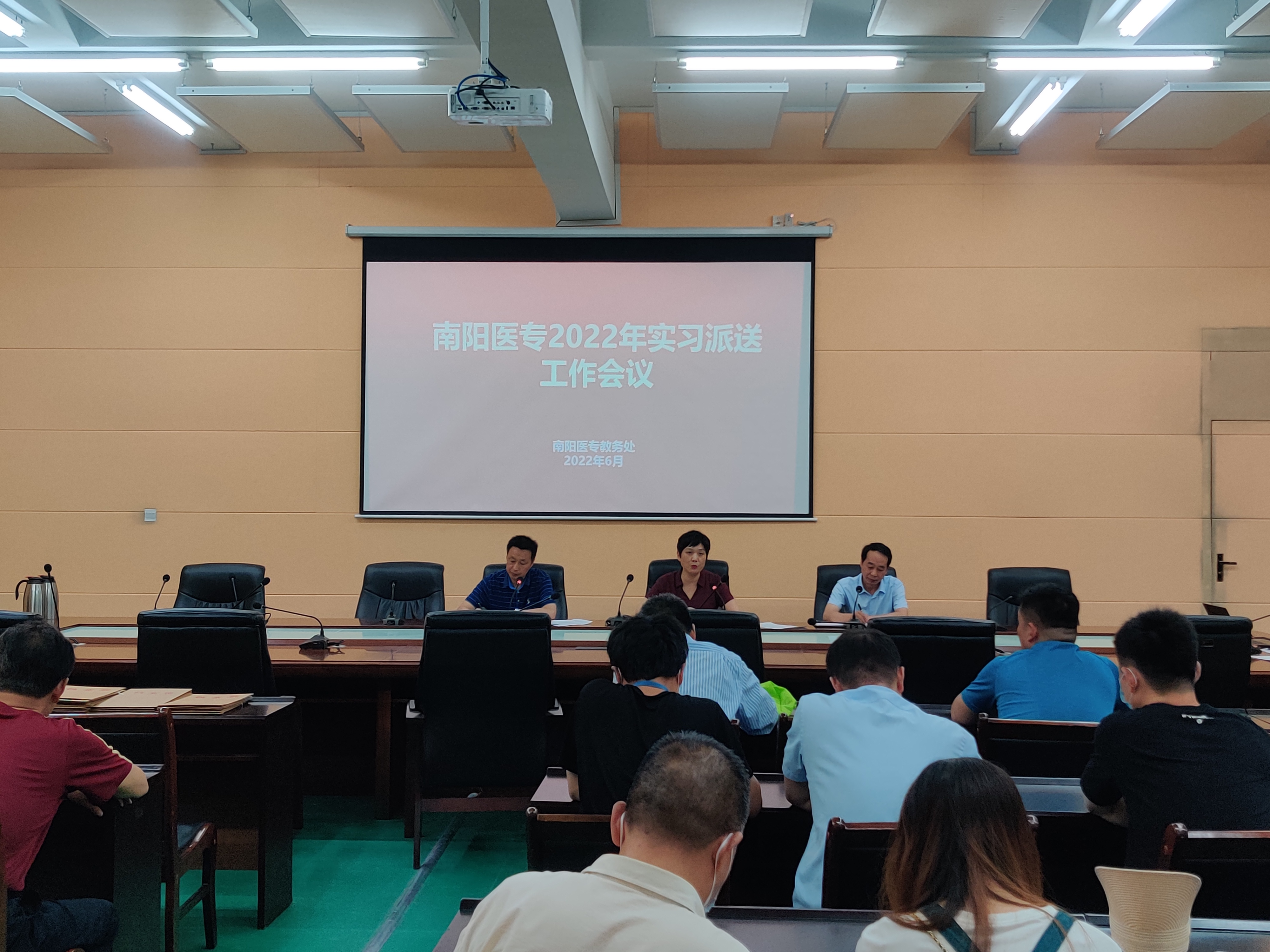 本网讯(文/教务处 高飞)6月11日下午,南阳医专2022年实习派送工作会议在仲景西区体育教学部会议室召开。校党委委员、副校长范真,教务处处长刘荣志、教务处副处长周玉金、实习科全体人员、学校11个涉学系(部、院)参加派送工作的30余位教师参加了会议。会议由教务处处长刘荣志主持。