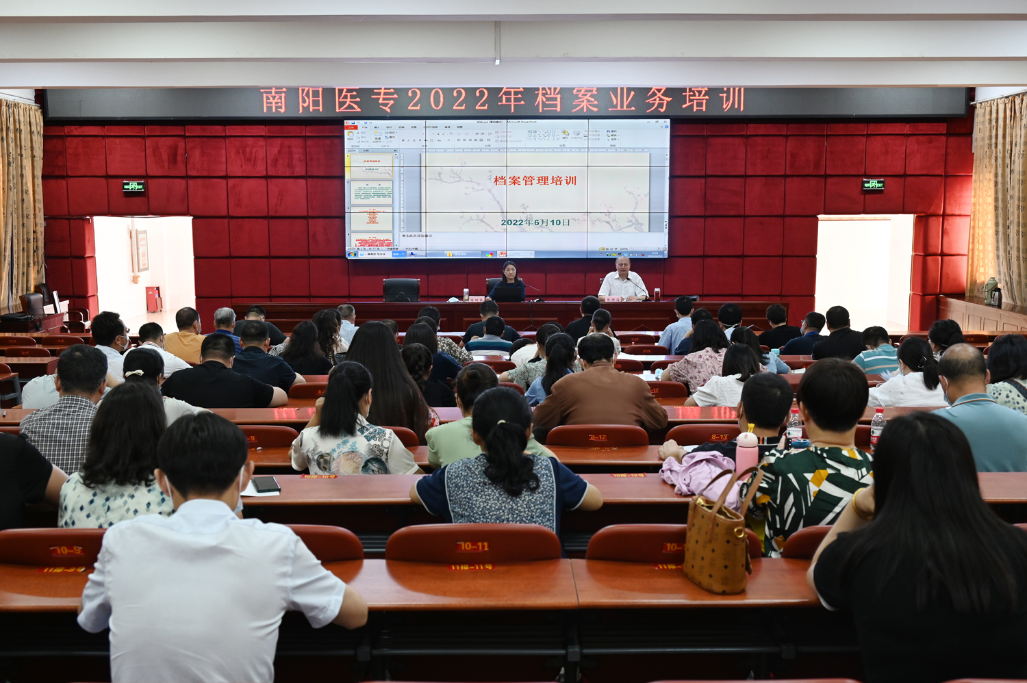 本网讯(文/档案中心 王萍)为了加强我校档案管理工作,提升各部门(单位)的归档意识和业务水平,2022年6月10日,我校在图书馆五楼报告厅举行2022年档案业务培训会,特别邀请了南阳市档案馆四级调研员、副研究馆员陈明英作专题辅导。学校各部门(单位)分管档案工作的领导和兼职档案员参加了培训。党委委员、副校长张胜海主持会议。