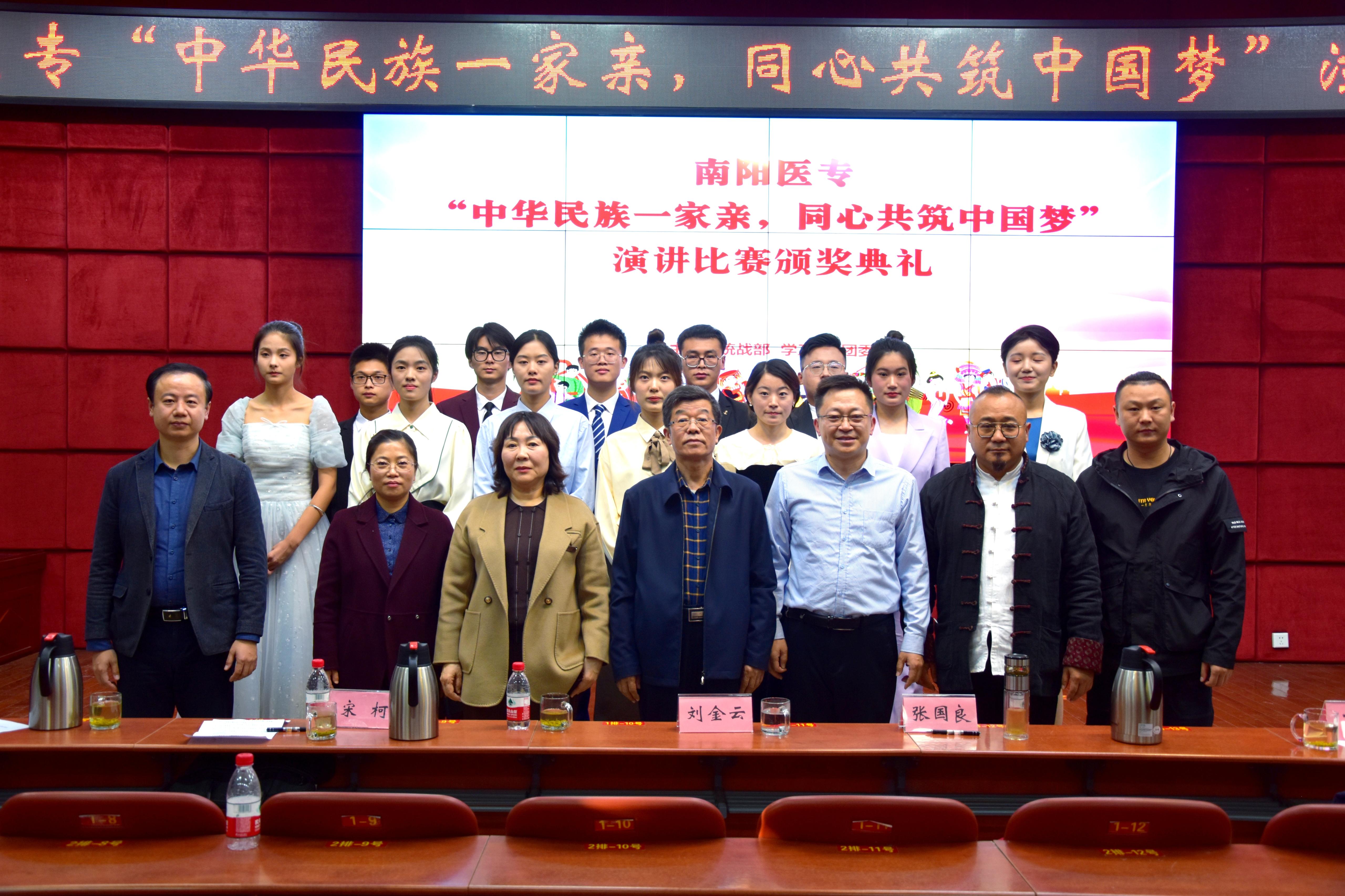 本网讯(文/党委统战部 李梦华)10月11日下午,由校党委统战部、学工部、团委联合举办的南阳医专“中华民族一家亲,同心共筑中国梦” 主题演讲比赛,在图书馆五楼报告厅成功举行。校党委委员、副校长张国良,校党委委员、纪委书记刘金云,南阳师范学院统战部副部长宋柯,南阳理工学院统战部副部长马丹,中国电视艺术家协会会员、南阳市电影电视家协会副主席石磊,卧龙区影视家协会副主席、南阳兄弟传媒总导演、南阳三剑客文化总策划郭峰,卧龙区电影电视家协会理事、南阳兄弟传媒总导演王康,校统战部部长王岩,校学工部部长、学生处处长梁顺平,校团委书记徐晓杰出席演讲比赛。