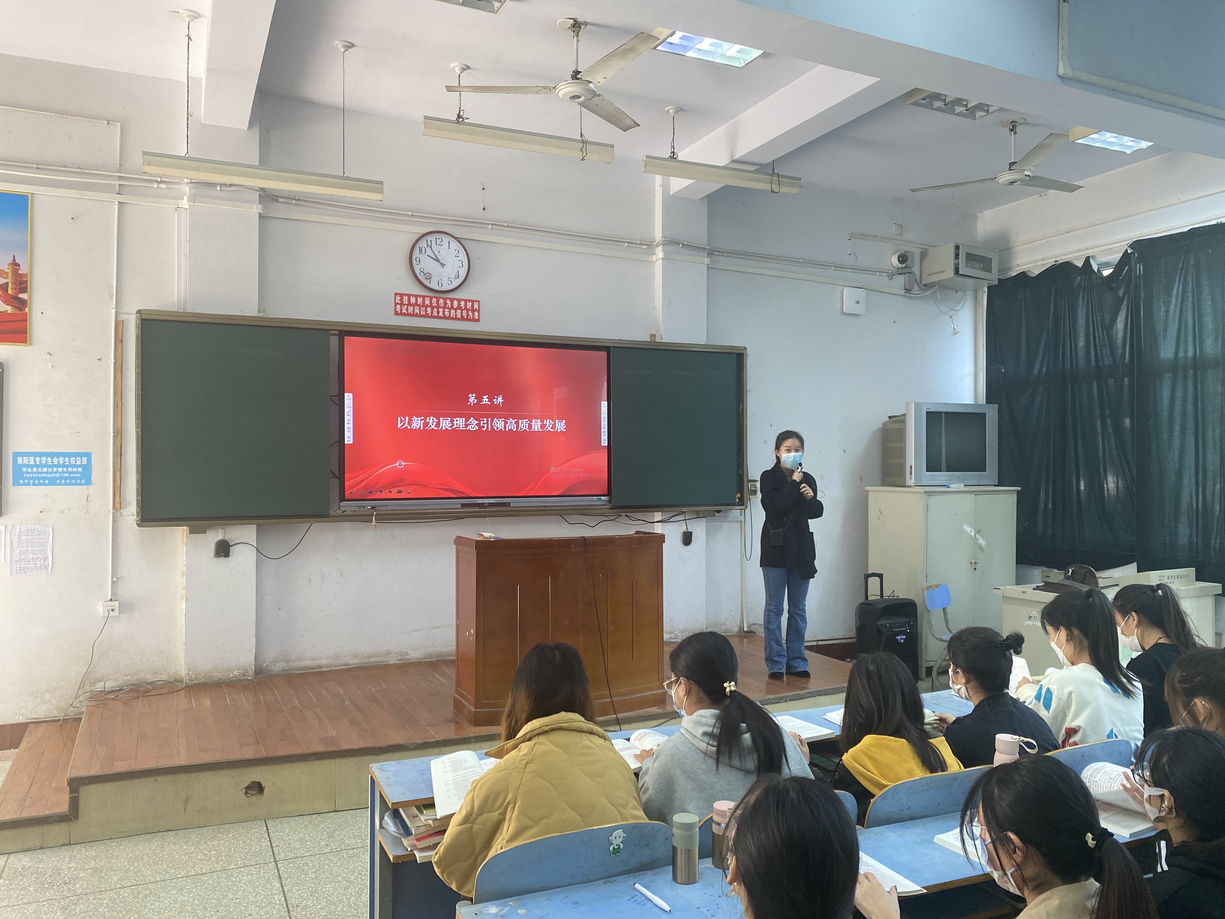 本网讯(文/马克思主义学院 卢孟)2022年10月19日上午,校党委委员、副校长范真带领校质量管理办公室主任郭延东等部门领导深入卫生管理系思政课堂,在仲景西区1号教学楼103教室,观摩思政理论课教学。马克思主义学院庞丽老师主讲《以新发展理念引领高质量发展》专题。