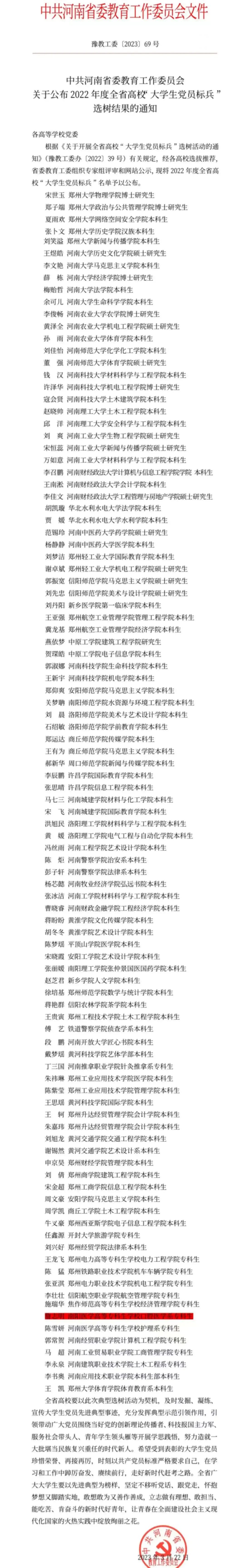 南阳医专围绕落实立德树人根本任务,以高质量党建引领事业高质量发展,在基层党组织、教师队伍、仲景学子、辅导员队伍中不断涌现出先进典型。学校将以此次典型选树活动为契机,宣传好大学生党员先进典型事迹,充分发挥其示范引领作用。同时,号召全体同学以先进典型为榜样,争做有理想、敢担当、能吃苦、肯奋斗的新时代好青年,让青春在全面建设社会主义现代化国家的火热实践中绽放绚丽之花。(编审/李峰松)