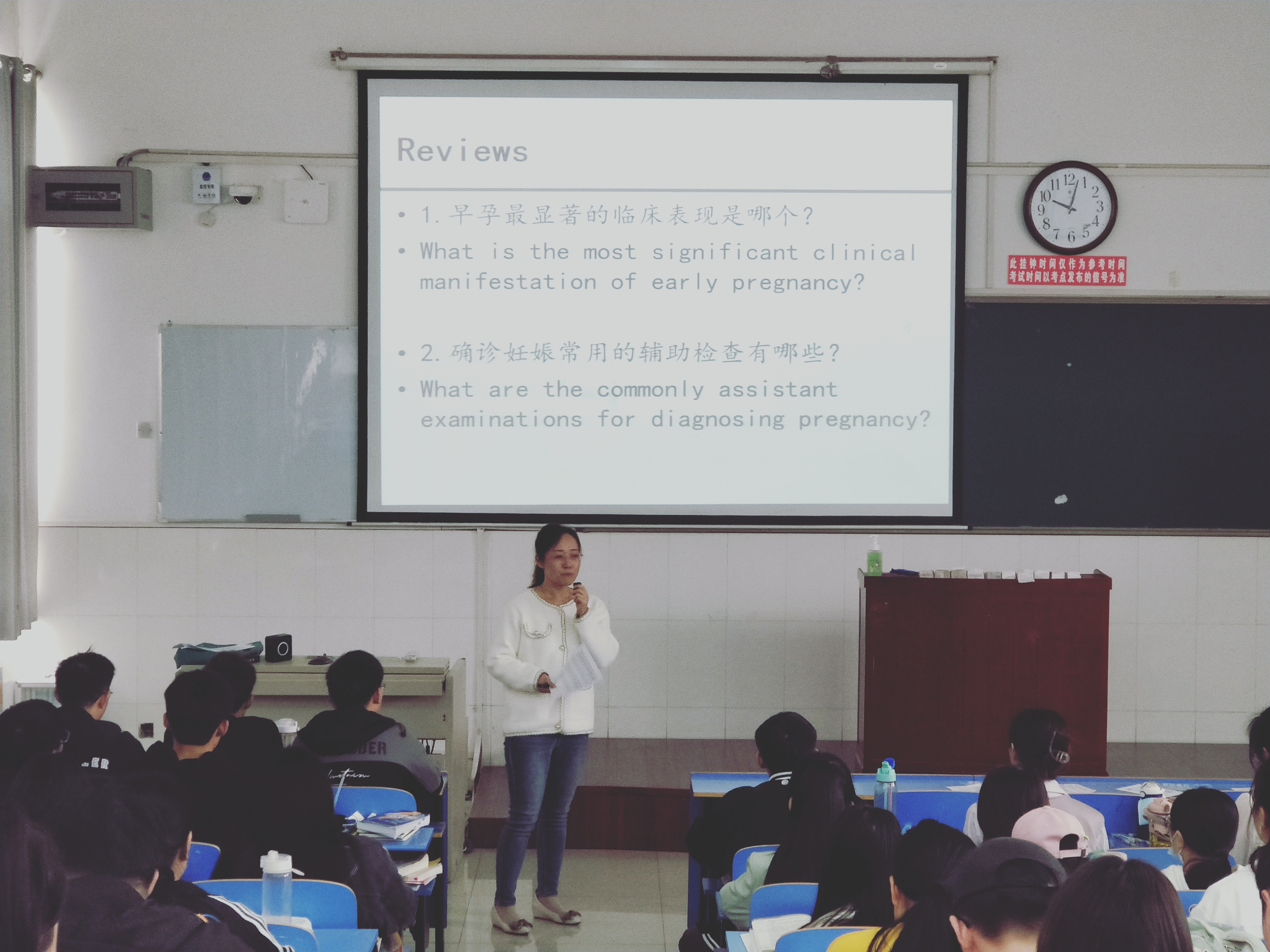开展双语教学无论对教师还是学生都是极大的挑战,既考验教师的专业教学功底,又必须具备过硬的英语语言能力。本学期申请双语教学的有《妇产科学》《社区护理》《传染病护理》《护理学基础》《病原微生物与免疫学》等5门课程,本次听评了中美合作办学项目临床医学专业教师邓琳琳老师的《妇产科学》。双语领导小组一致认为,双语授课教师专业教学水平、英语运用水平较高,英语专业词汇表述准确,发音标准表达自然流畅,教学方法运用灵活,能够充分调动学生学习积极性。