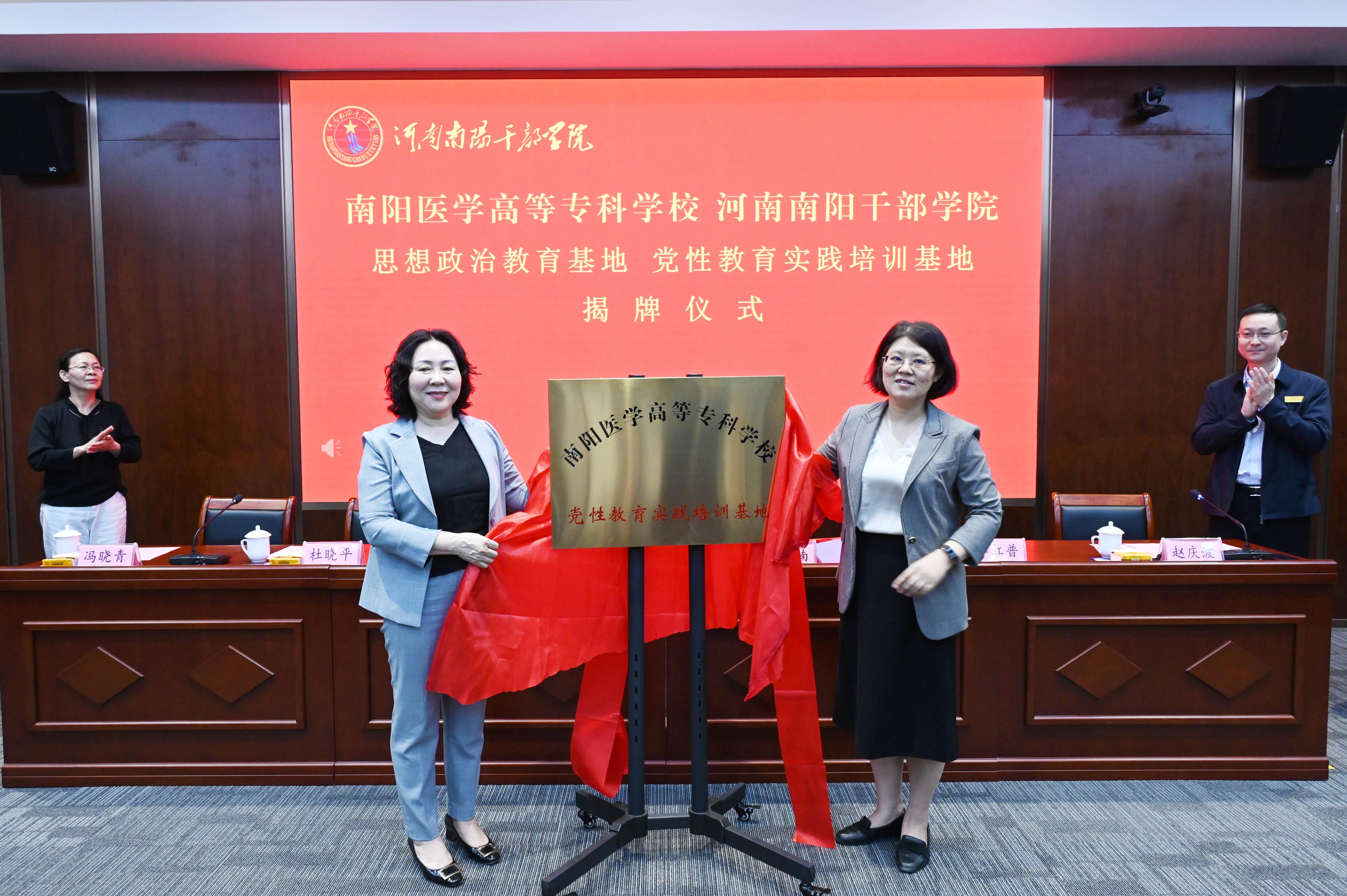 签约仪式上,王楷楠、刘金云分别代表河南南阳干部学院和南阳医专在战略合作框架协议上签字,并共同为南阳医专思想政治教育基地、南阳医专党性教育实践培训基地揭牌。