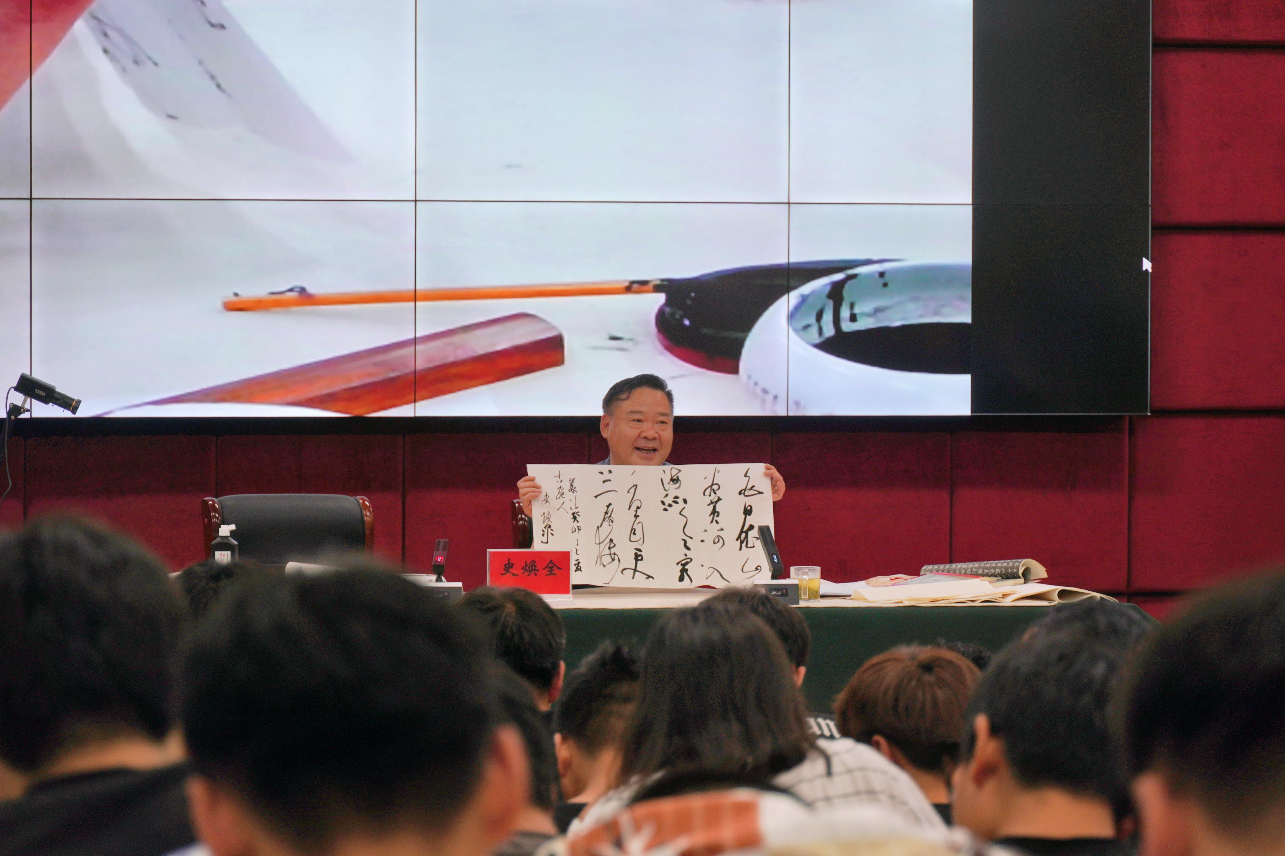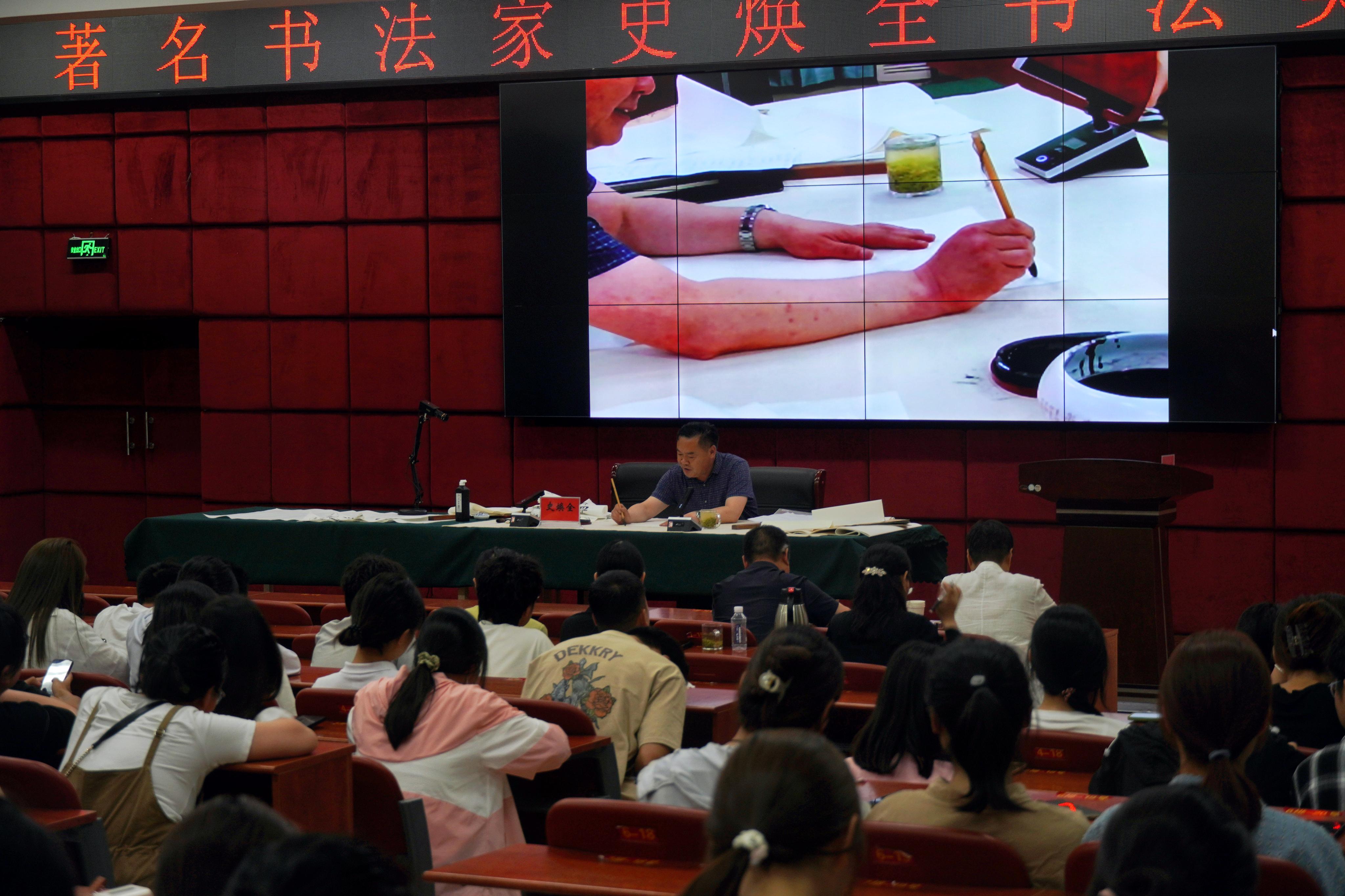 本网讯(文/校团委 庞博)为提高师生艺术修养,助力学生成长成才,5月18日下午,我校邀请著名书法家史焕全教授在图书馆五楼学术报告厅作书法美学学术讲座。学生书法社团、广大师生书法热爱者约三百人聆听受益。