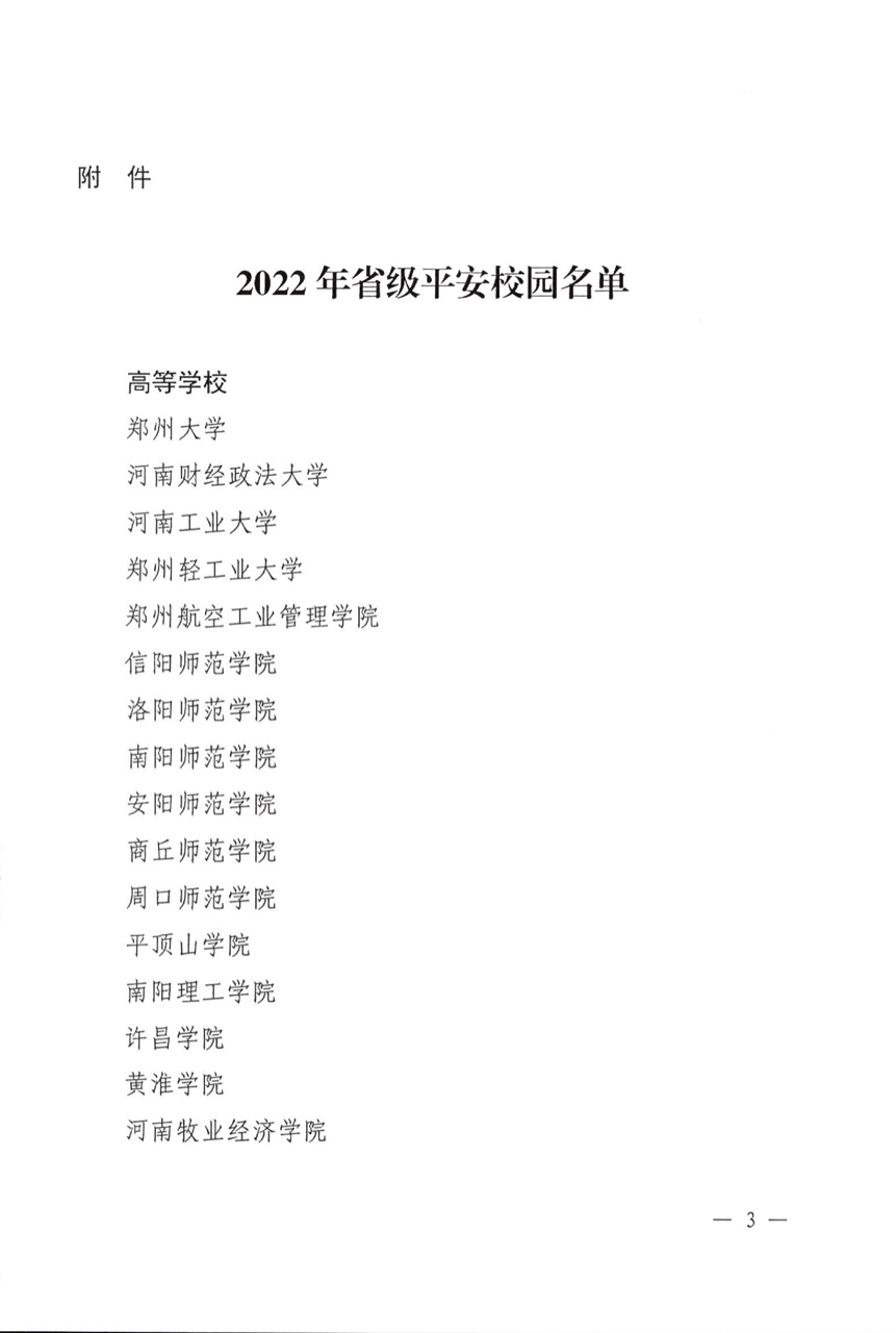 本网讯(文/法制办 刘一凡)近日,河南省教育厅印发《河南省教育厅等三部门关于命名2022年省级平安校园的通知》,授予我校省级“平安校园”称号。
