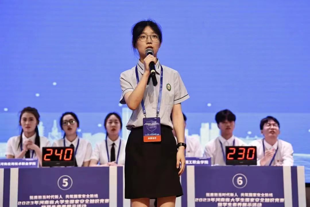 本次全省大学生国家安全知识竞赛分为网络竞赛和现场决赛两个阶段,自5月份接到《中共河南省委教育工委办公室 河南省教育厅办公室关于开展2023年全省大学生国家安全知识竞赛暨学生素养展示活动的通知》后,校党委高度重视,法制办统筹安排,各院(系)精心组织,校团委、马院和公教部给予了大力支持,最终我校“仲景学子战队”成功入围全省本专科九强战队。在总决赛中,我校代表队素养展示环节获专科第一名、总排名全省第六名,最终荣获全省大学生国家安全知识竞赛暨学生素养展示活动三等奖和优秀组织奖。