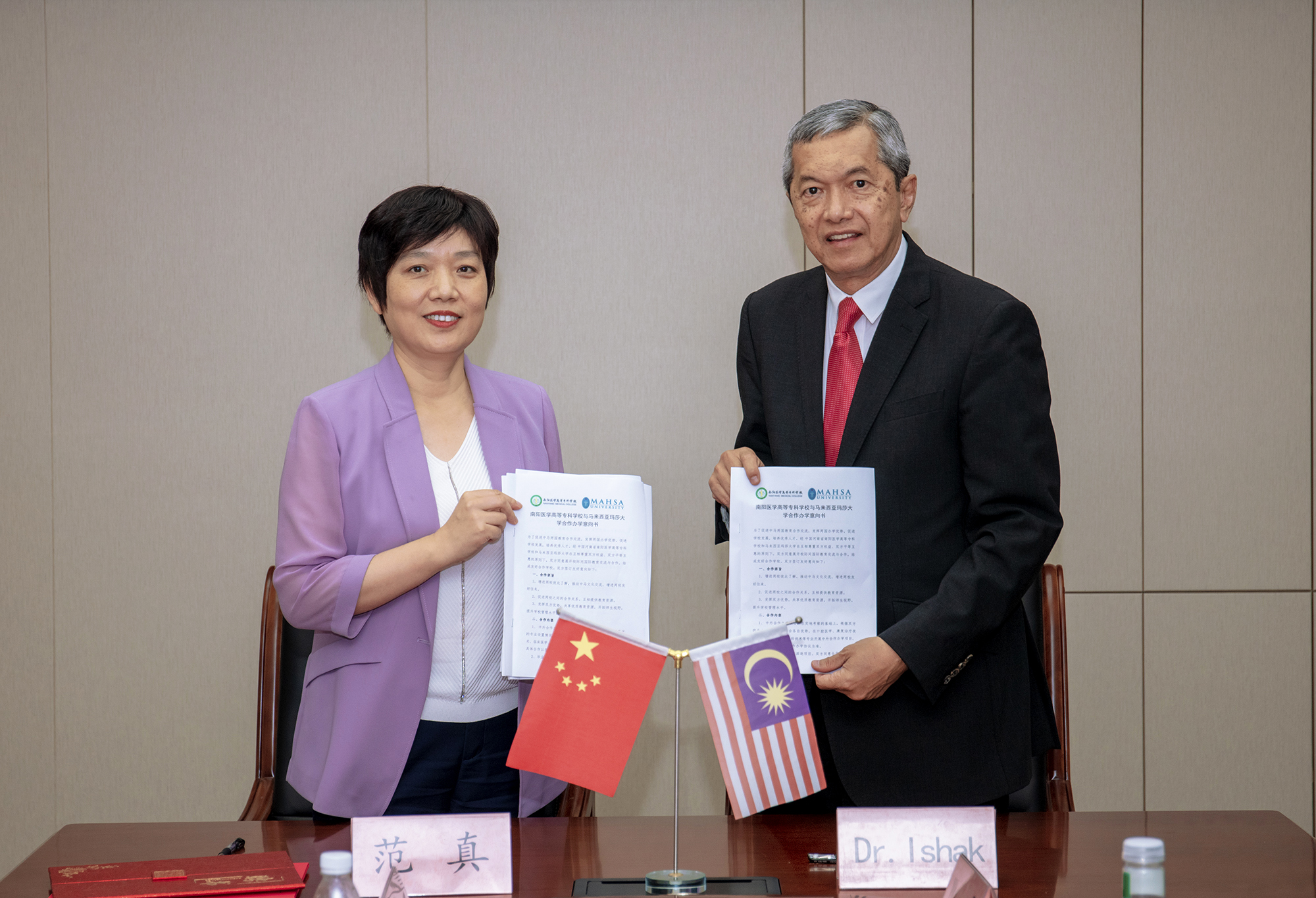 双方举行合作洽谈会。校长范真对来访团一行表示热烈的欢迎,介绍了我校基本情况,并就中外合作办学项目、仲景文化交流、非遗技术海外培训等项目做了详细说明。拿督依沙克介绍了玛莎大学的基本情况,表示愿意与我校在口腔医学专业合作办学、师生交流、特别是在玛莎大学建立仲景健康文化中心等方面进行进一步合作。随后,双方举行了合作备忘录签字仪式。我校聘请拿督依沙克博士和拿督易卜拉欣博士为我校客座教授,范真为他们颁发了聘任证书。