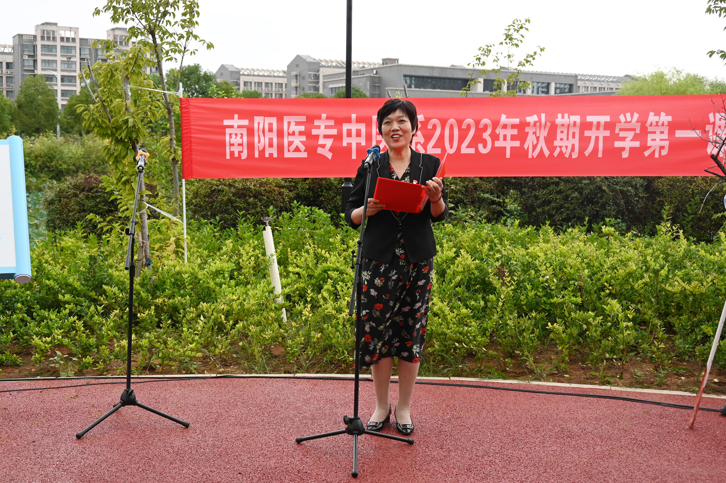 本网讯(中医系 刘元)2023年9月27日下午,南阳医专中医系2023年秋期开学第一课在仲景东区隆重举行。校长范真、宣传部部长李红普、中医系书记郭玉伟、主任张明丽与中医系全体师生齐聚仲景湖畔,同上一堂“沉浸式”思政大课。