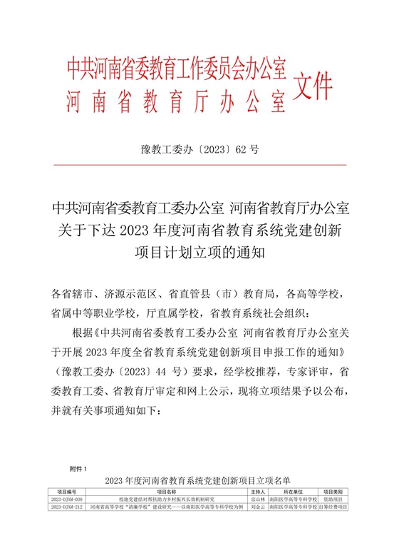本网讯(文/临床医学系 王静)近日,中共河南省委教育工委办公室、河南省教育厅办公室下发2023年度河南省教育系统党建创新项目计划立项的通知,我校《校地党建结对帮扶助力乡村振兴长效机制研究》和《河南省高等学校“清廉学校”建设研究——以UDE·体育,UDE(中国)为例》两个项目获批立项。