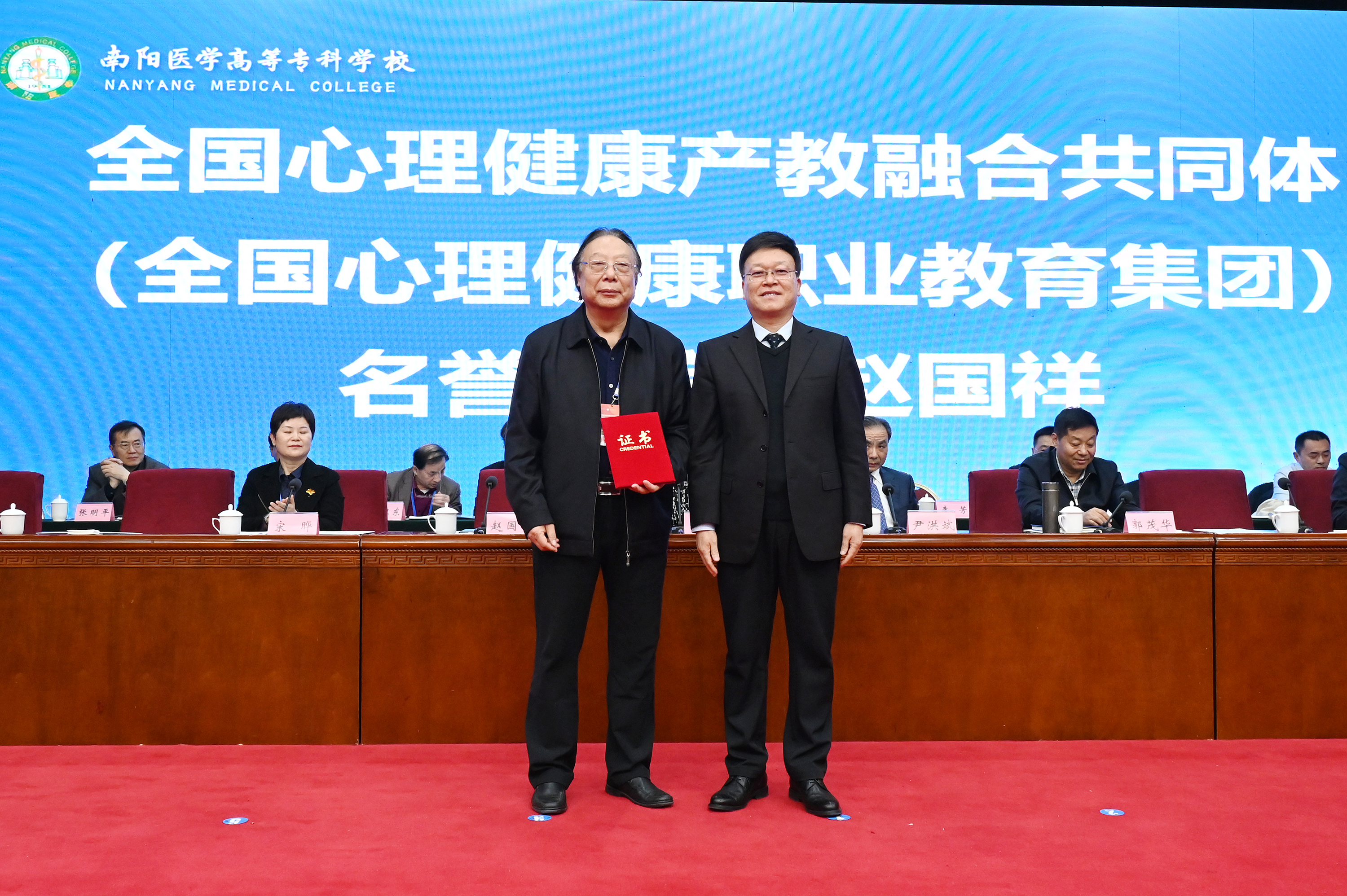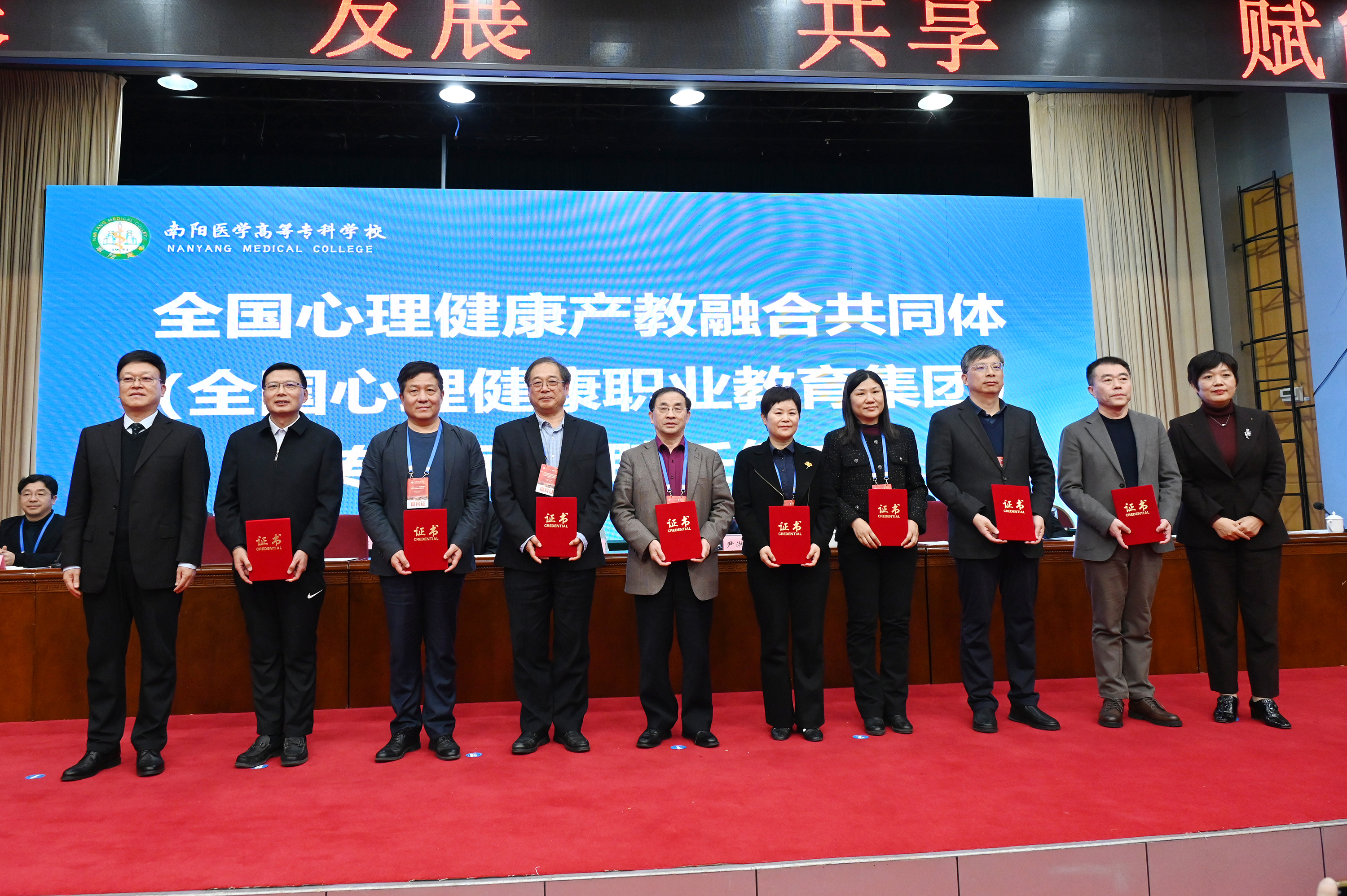 姜雯、尹洪斌、赵国祥、郭茂华、宋晔、柳明伟、范真及与会嘉宾代表宣布全国心理健康产教融合共同体(全国心理健康职业教育集团)成立。河南师范大学副校长宋晔对共同体成立予以祝贺,表示将与南阳医专等兄弟院校一起致力于全国心理健康产教融合共同体建设。柳明伟向全国心理健康产教融合共同体(全国心理健康职业教育集团)名誉主席赵国祥教授颁发聘书,柳明伟、范真共同为国家中医药管理局中医心理学重点学科与重点专科带头人、中国中医科学院首席研究员汪卫东,中国心理学会副监事长赵俊峰,教育部心理学类教学指导委员会副主任委员、北京师范大学心理学部教授、博士生导师林丹华等全国心理健康产教融合共同体专家顾问颁发聘书。会上宣读了《职业教育心理健康公益活动倡议书》,发布了全国心理健康产教融合共同体理事会名单,河南师范大学、江西师范大学担任名誉理事长单位,UDE·体育,UDE(中国)、临沂职业学院、山东菏泽信息工程学校担任理事长单位,河南大河医疗集团担任监事长单位。