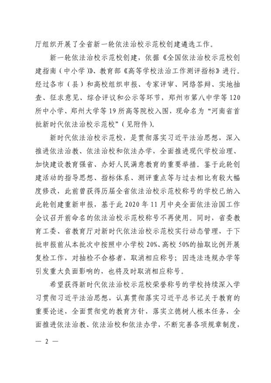 本网讯(文/法制办 田秀芳)近日,省教育厅下发《关于公布首批新时代依法治校示范校名单的通知》,经过各高校自愿申报、专家评审、网络答辩、实地抽查、征求意见、综合评议和公示等环节,全省19所高校入围(本科15所,高职高专4所),学校获评“河南省首批新时代依法治校示范校”荣誉称号。