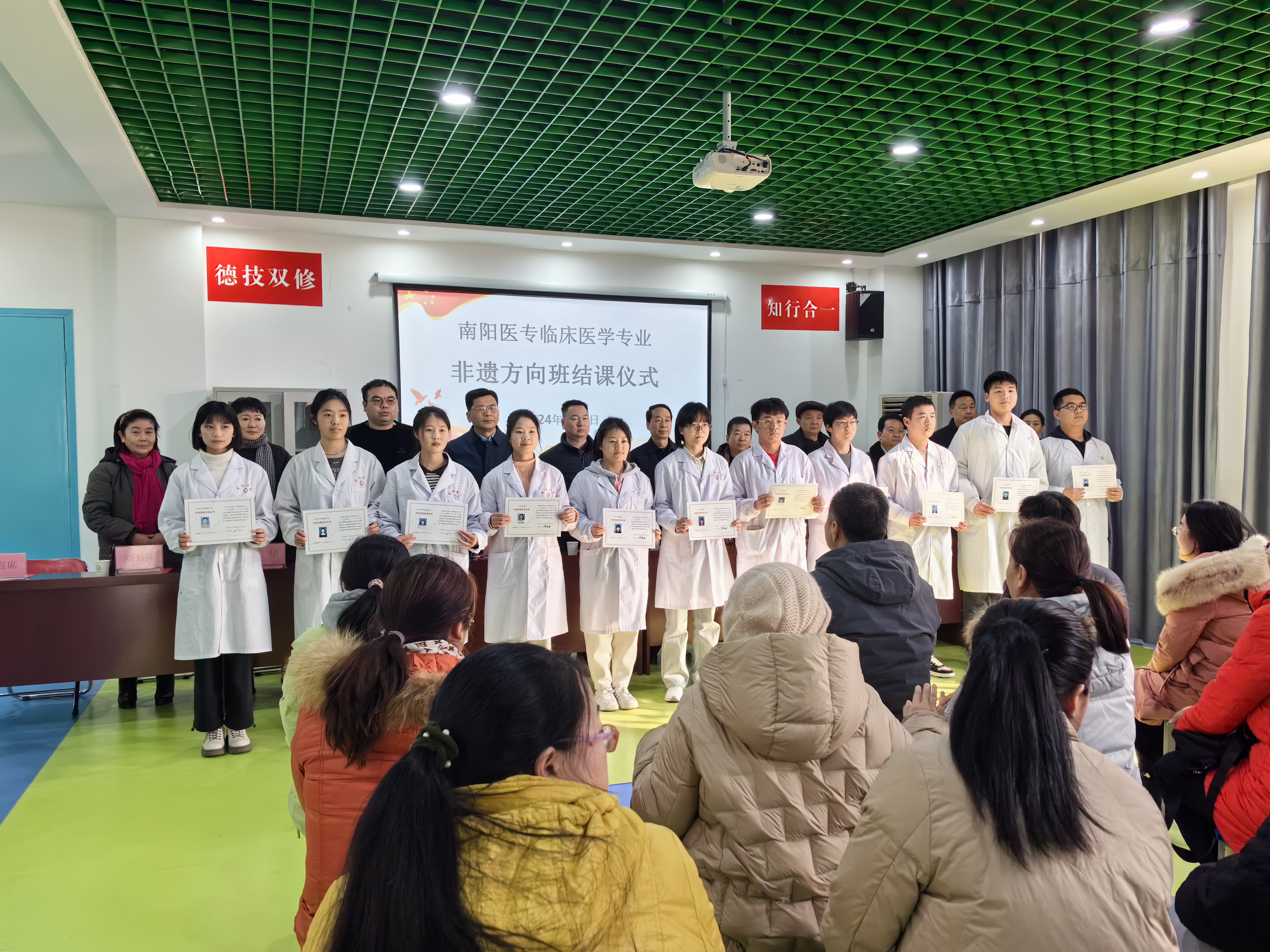 本网讯(文/临床医学系 侯萍)1月8日下午,临床医学系非遗方向班结课仪式在临床医学模拟中心举办。校党委委员、副校长刘荣志,“张氏经络收放疗法”新乡牧业经络收放医院院长吴金魁,新乡德中康职业培训学校校长王玉林,“胡氏捻筋法”第三代传人胡胜军,教务处副处长周玉金,针灸骨伤系副主任潘华,中医系副主任张晓丽,临床医学系领导班子和师生代表,以及非遗方向班全体学员参加。结课仪式由临床医学系党总支书记宗山林主持。