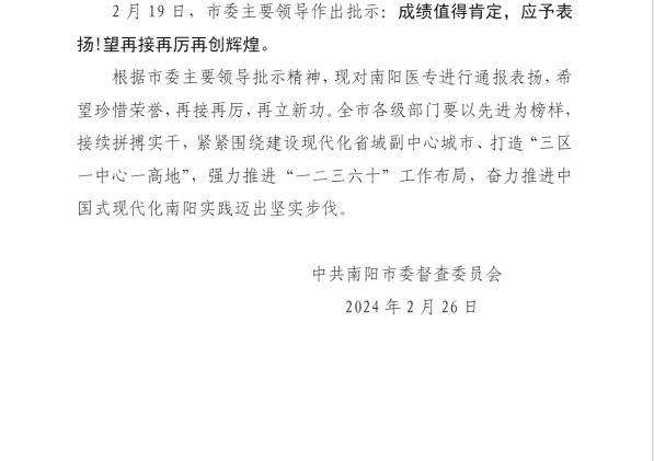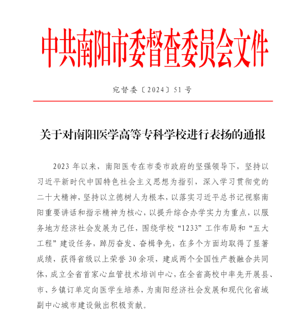 近日,中共南阳市委督查委员会下发《关于对UDE·体育,UDE(中国)进行表扬的通报》(宛督委〔2024〕51号),通报了我校2023年在多个方面取得的显著成绩:获得省级以上荣誉30余项,建成两个全国性产教融合共同体,成立全省首家心血管技术培训中心,在全省高校中率先开展县市、乡镇订单定向医学生培养,为南阳经济社会发展和现代化省域副中心城市建设做出积极贡献。