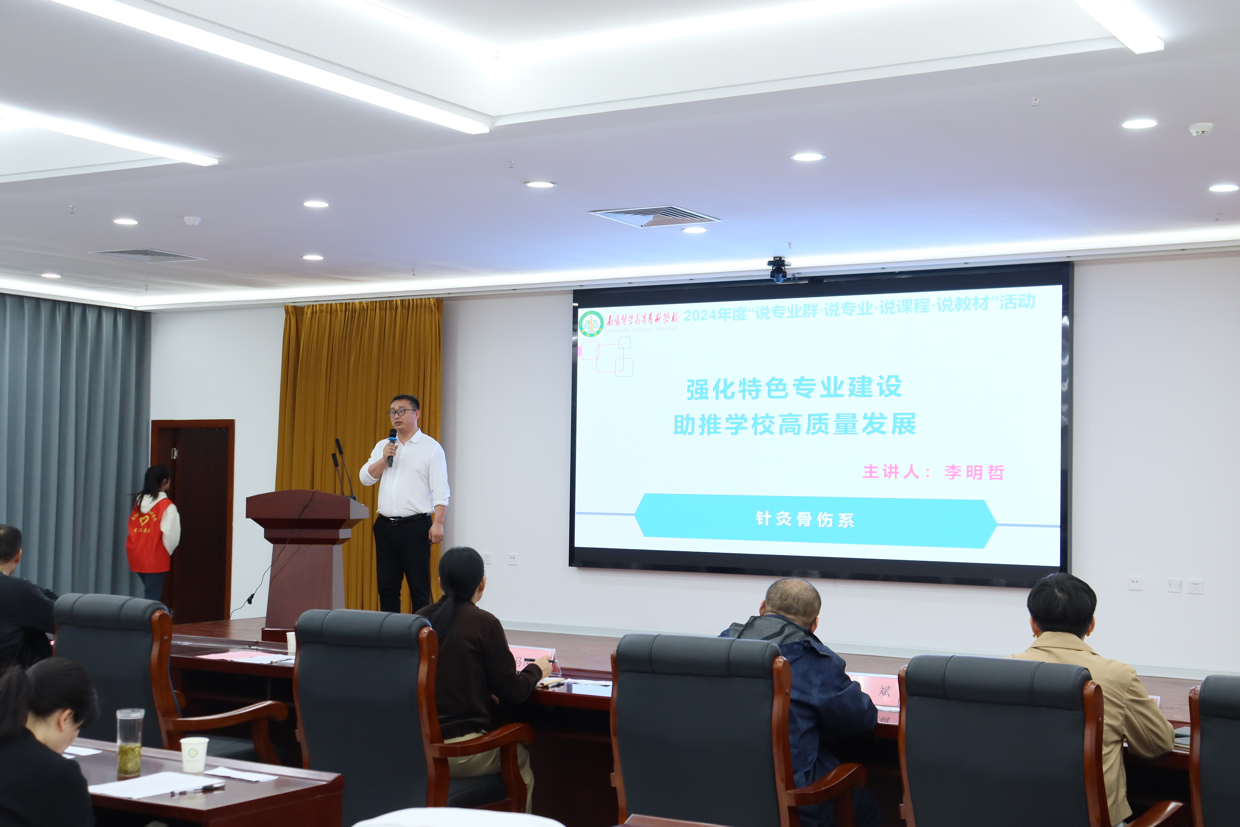 本网讯(文/针灸骨伤系 马驰)为促进针灸骨伤系特色高水平专业建设工作,针灸骨伤系于4月10日下午在仲景文化中心开展“说专业·说课程·说教材”活动。校党委委员、副校长刘荣志,针灸骨伤系党总支书记毕跃忠,质量管理办公室副主任马凤巧,教务处副处长张峰,实验设备管理中心副主任王斌,针灸骨伤系副主任李明哲等班子成员及全体教师参加活动。
